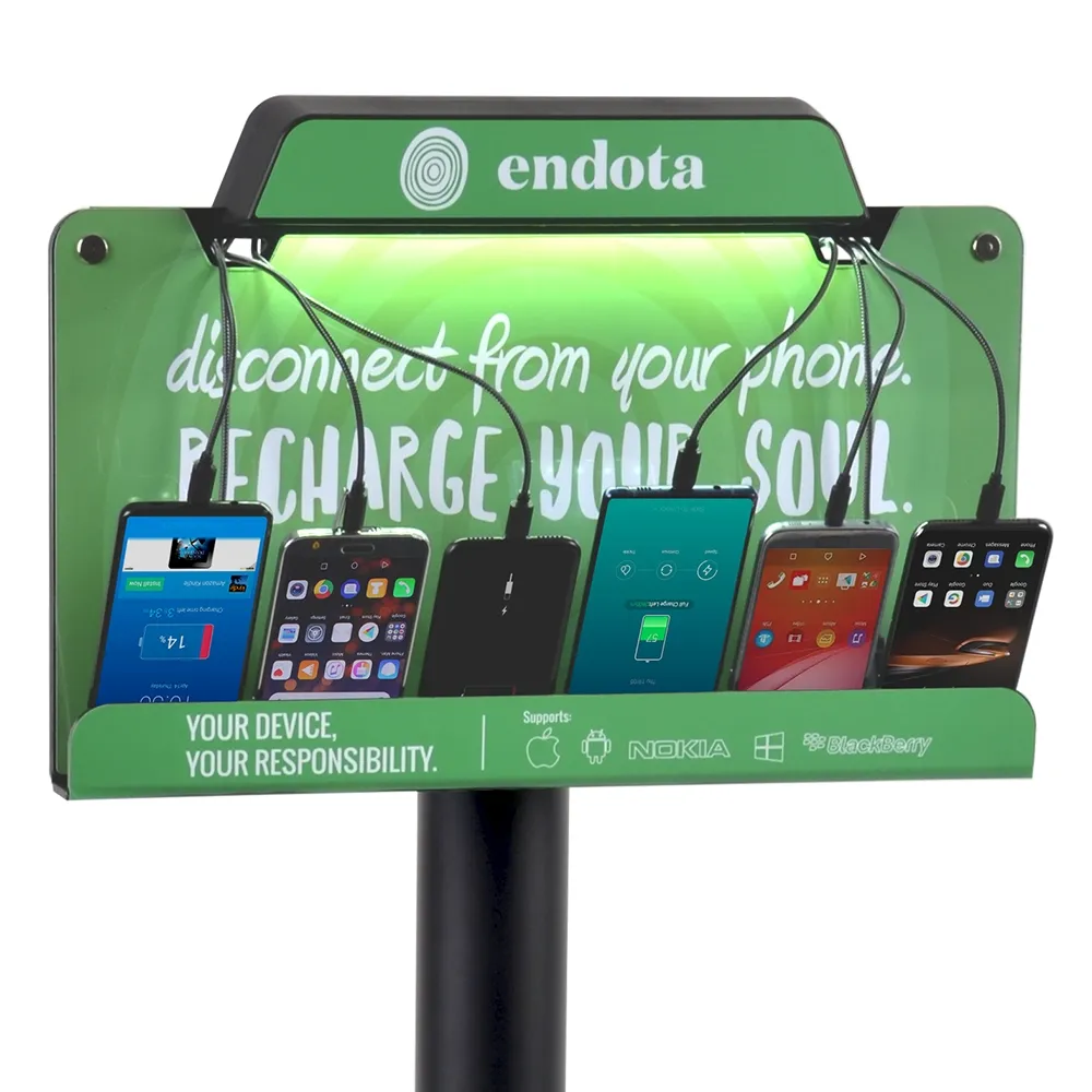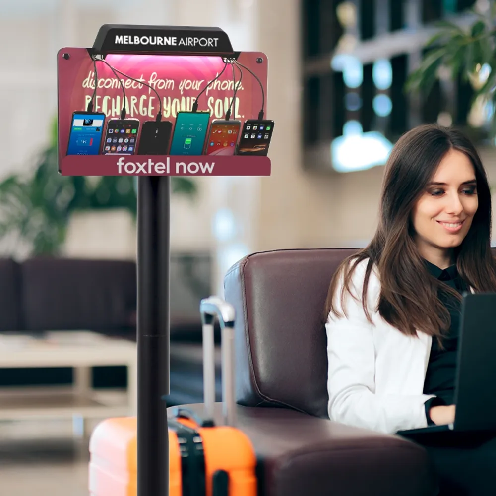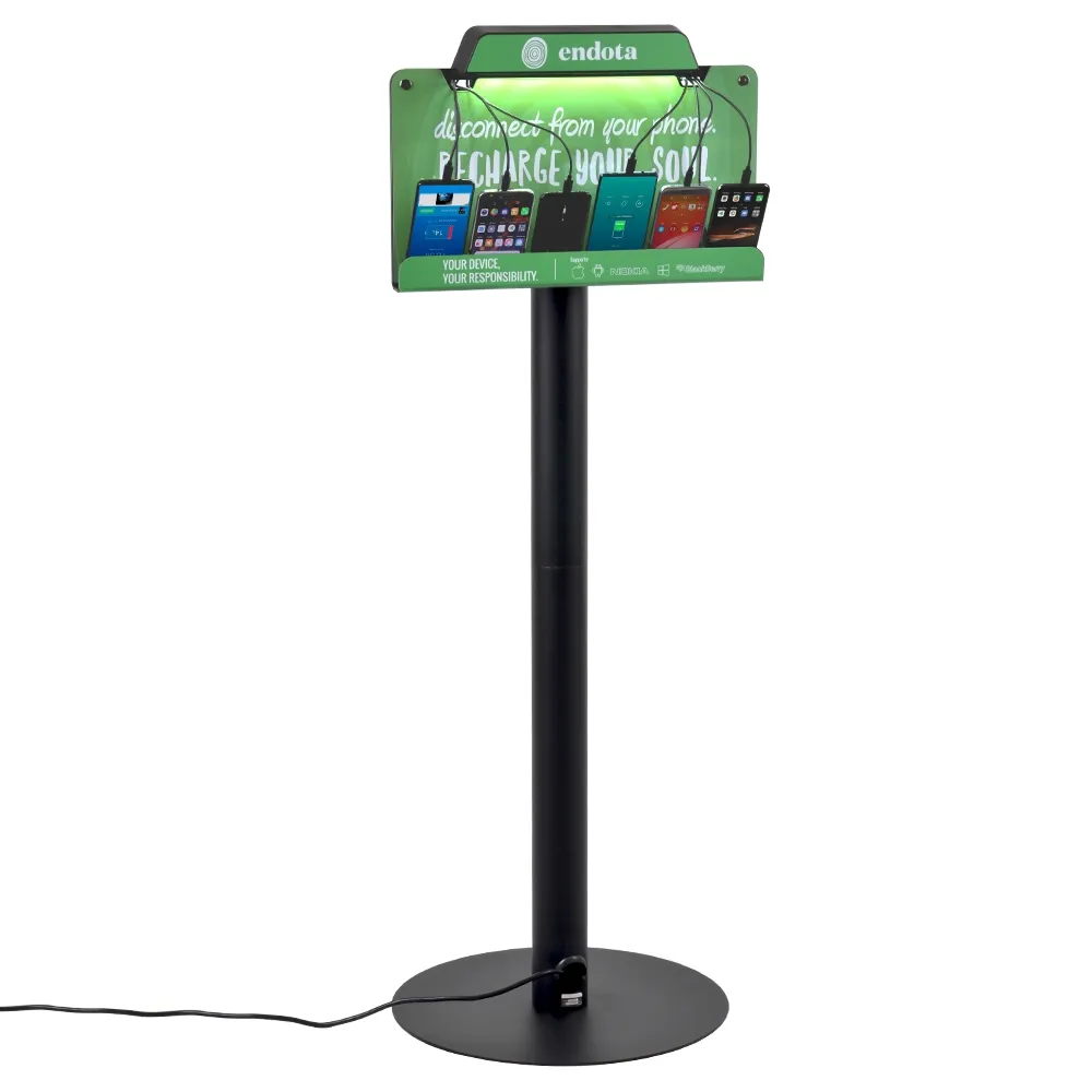 The multi phone charging station has a large 255 x 480 x 30mm tray to hold different devices as they charge. The 45mm raised front lip keeps items from slipping off whilst angling them to make the screens easier to read. What sets this unit apart is custom graphics printed in (3) places to fully brand this display to match your colour scheme and keeps your company name fully in visitors minds. The back of the unit has a large 480 x 255mm area perfect for logos, while the top 297 x 45mm header and 480 x 45mm tray front are great for describing what the display is for and informing of what connection types are available. All graphics are digitally printed in vivid, full colour and our in-house team is available to help with design needs using a range of packages to help meet any questions.