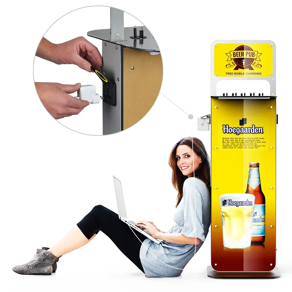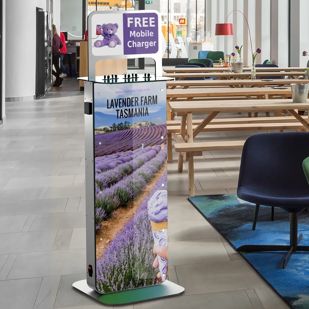 The charging station kiosk allows visitors to recharge their electronic devices for free, helping to build goodwill with visitors and entice customers to stay longer at your location. The public charger floor stands have (10) 290mm long retractable cables that can easily reach different phones and tablets with a variety of connectors to work with many devices. Included cable ends are (4) Apple® Lightning, (3) micro USB, and (3) USB-C for use with Android® and other compatibles devices. In addition to the charging cords, there are power outlets on two sides of the stand to allow those with laptops or their own chargers to plug in!