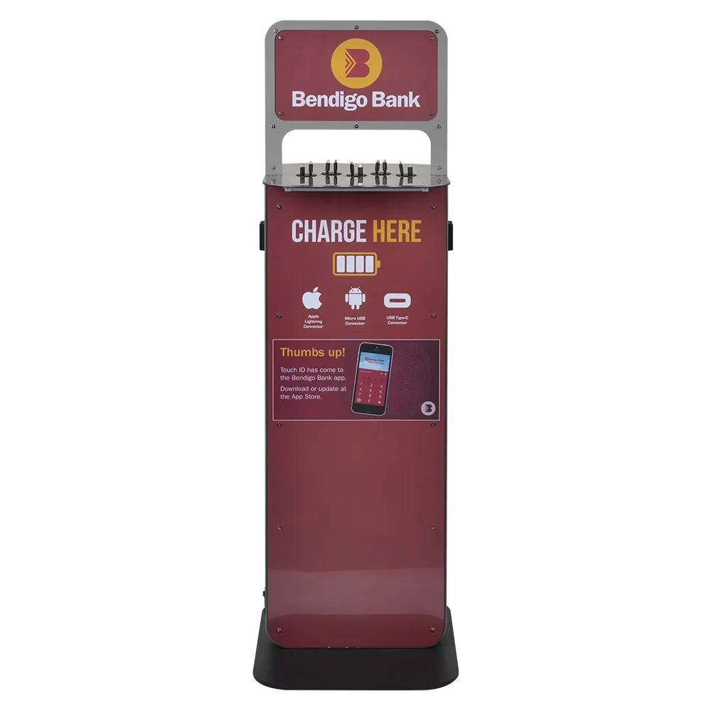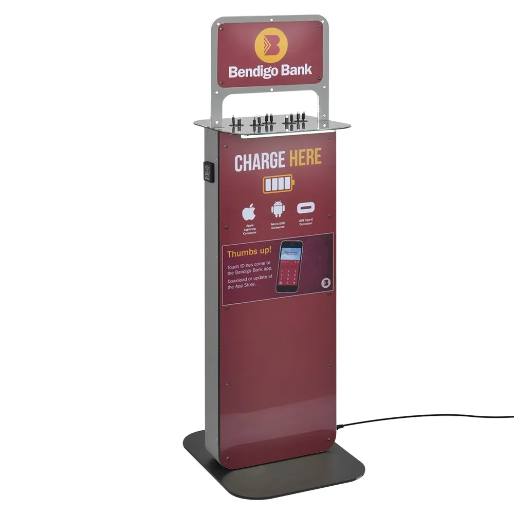 This electronic charging stations, charging station kiosk has a 364 x 205.5mm header area on either side of stand that can be used to draw attention to the unit. A top surface area is 420 x 410mm to allow users to place their phone down, with a 2.4mm thick acrylic face. The clear plastic makes it easy to clean the unit whilst protecting sensitive electronics. The main body of the stand has a large 1075 x 398mm area for more eye-popping graphics, with each side able to have different images to best communicate your brand and advertising with your clientele. A clear acrylic face also covers these graphics to help deter vandalism.
