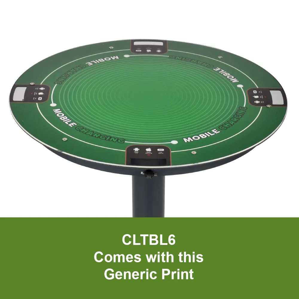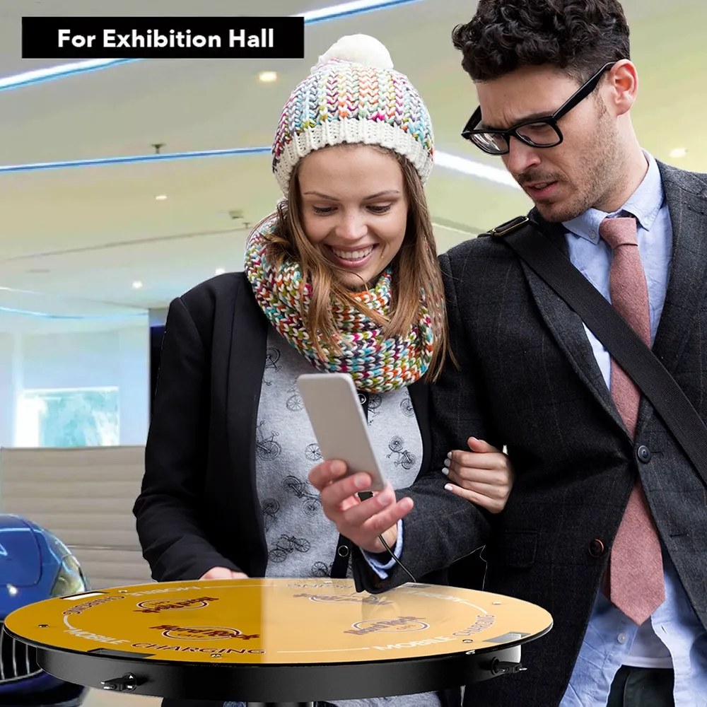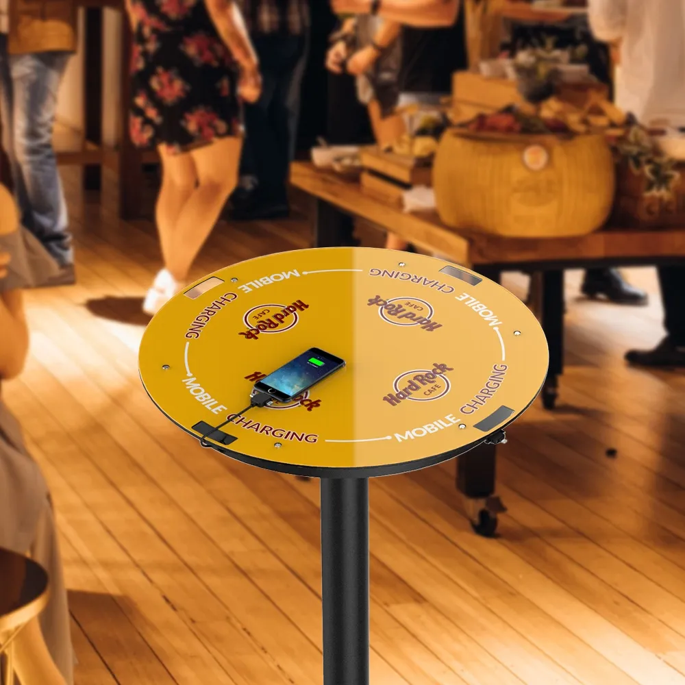 The power charging table, one of many available charging stations, has a 5mm thick plexiglass tabletop to protect sensitive electronics beneath the surface and make cleaning up simple. A replaceable graphic atop the table helps to capture the attention of visitors and inform them that they can recharge their devices at this station! This graphic includes information about what types of devices can be used at each station where the cords are. You can also chose to have your own custom version printed to fully integrate this station into your location's aesthetic! The 600mm top diametre gives not only heaps of space for devices, but also allows brochure holders or other merchandising displays to be placed, or when used as a cocktail table at an event plenty of space for patrons to interact and place personal items!