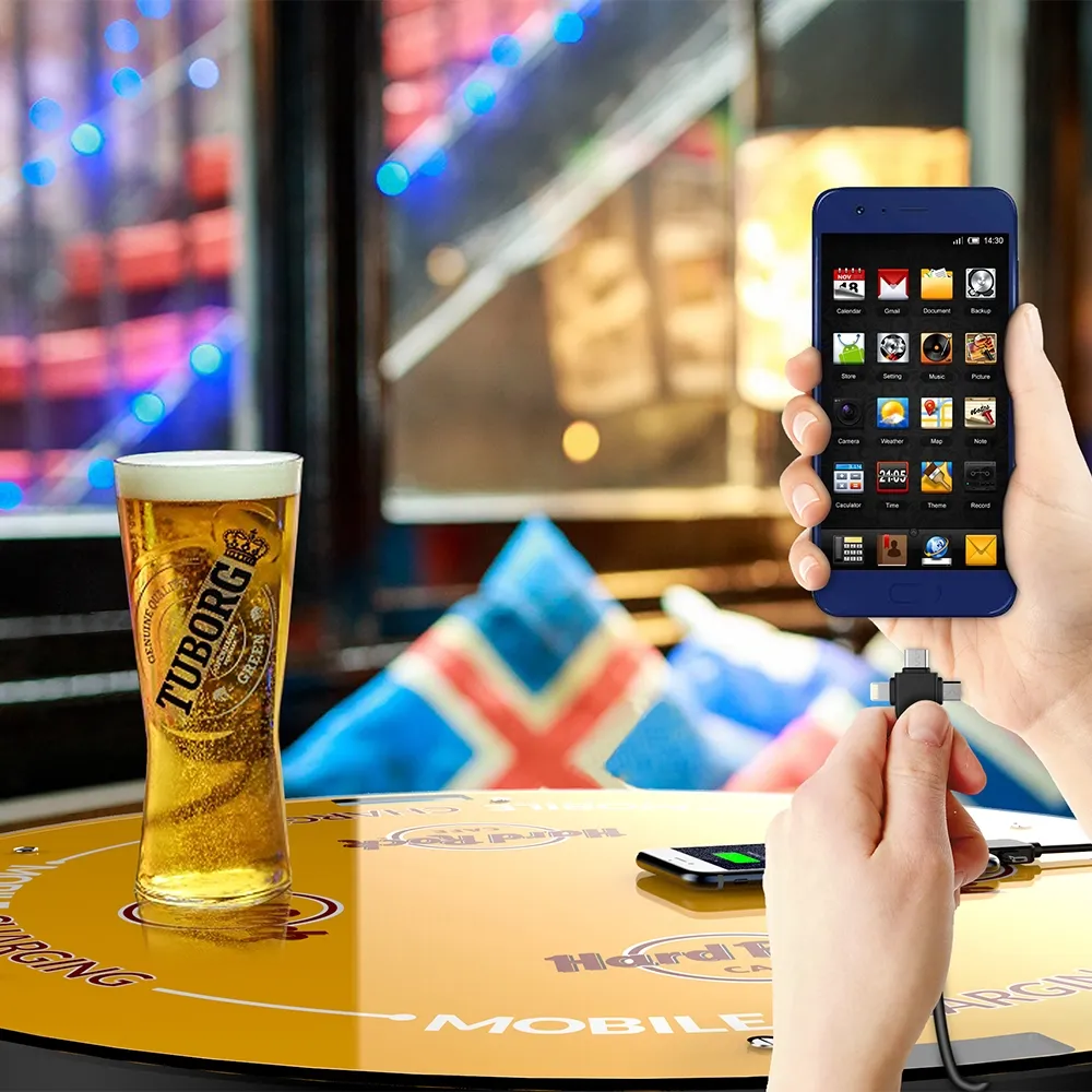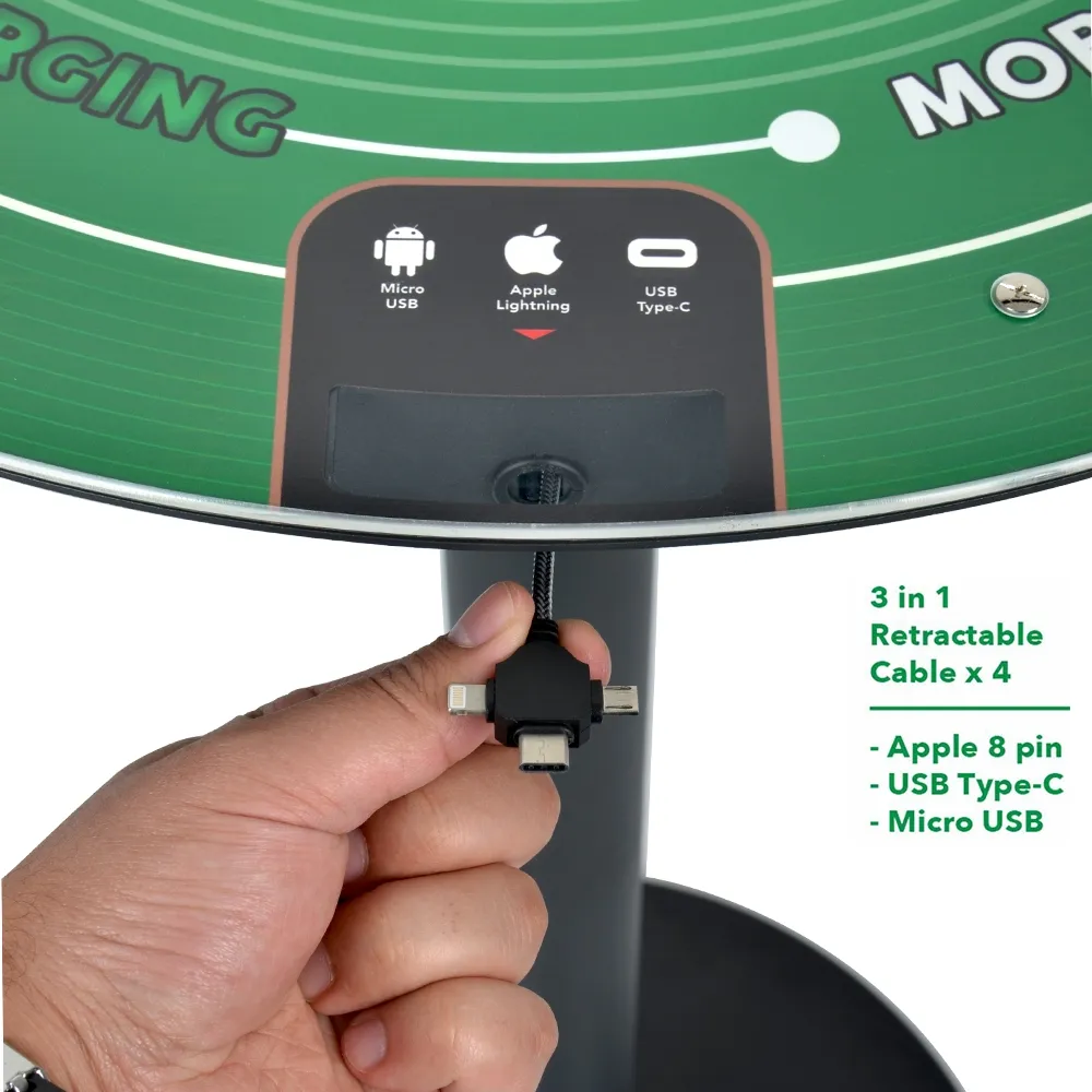 - (4) 3-in-1 connector cables set around table to offer multiple people charging access