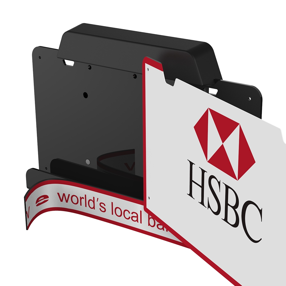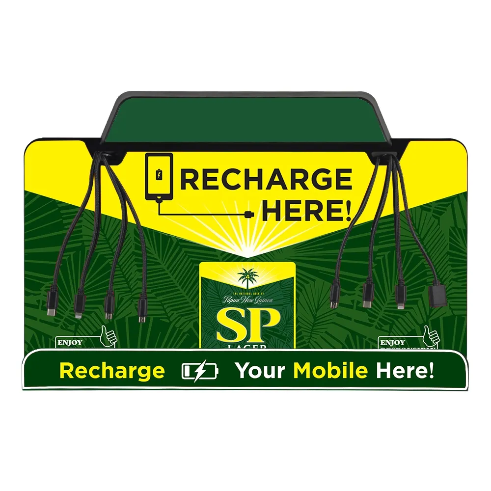 This charging station for mobile devices is designed to be branded, with your custom designs digitally printed and adhered onto the unit to provide location information, display logos, and use eye-catching colours to draw attention. The large back graphic is ideal for company logos, with the 297 x 45mm header typically used for another logo or company name. There is a 480mm wide tray to hold devices as they charge, with a 45mm tall front lip that also has a graphic affixed, typically displaying free mobile charging messaging. In-house experts are available to help with all graphic designs, with a range of packages available to suit your needs and price point!