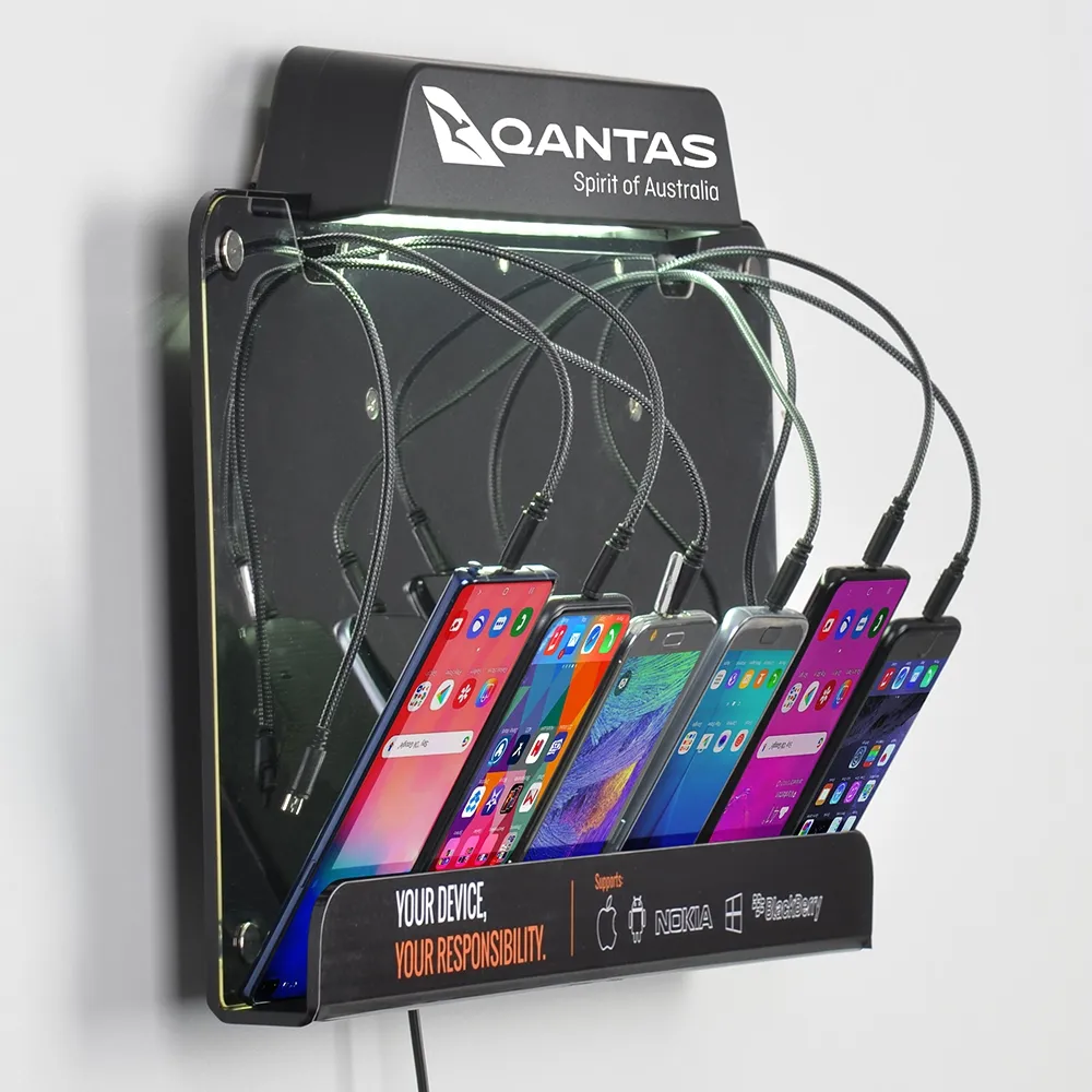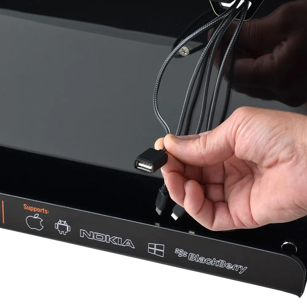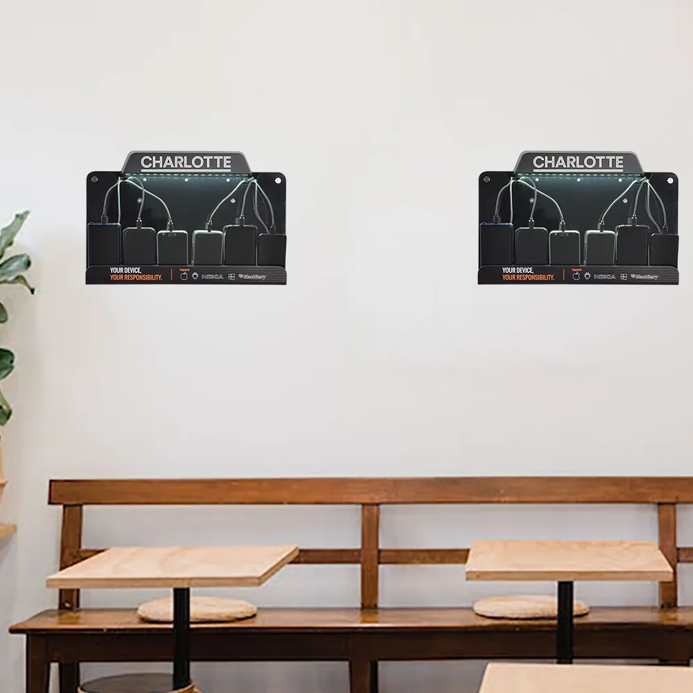 A charging station for mobile devices provides airports, lounges, cafes, gyms, lobbies, reception areas and more to provide convenience to visitors to allow them to stay longer. This is a wall mounted unit that can charge up to (8) devices at the same time! The tamper-proof cords feature connectors designed to work with a range of device types, including Android® and Apple® The nylon cords have (2) Lightning, (3) Micro USB and (2) USB-C connector ends, with (1) female USB for users to plug in their own cable if they have it in the even their device isn't compatible.