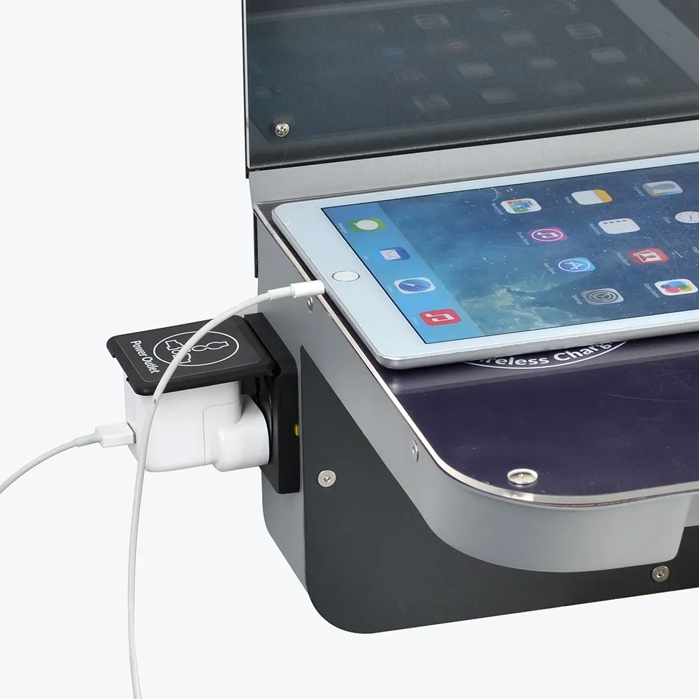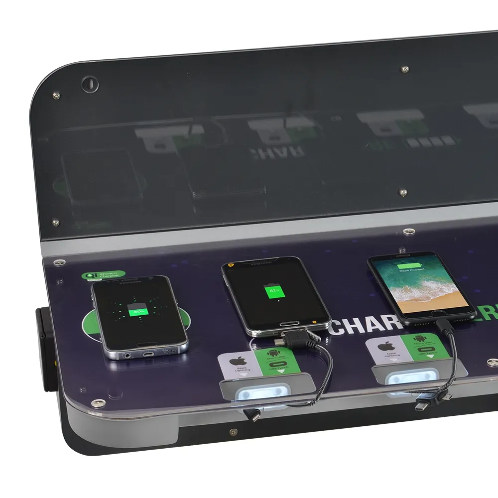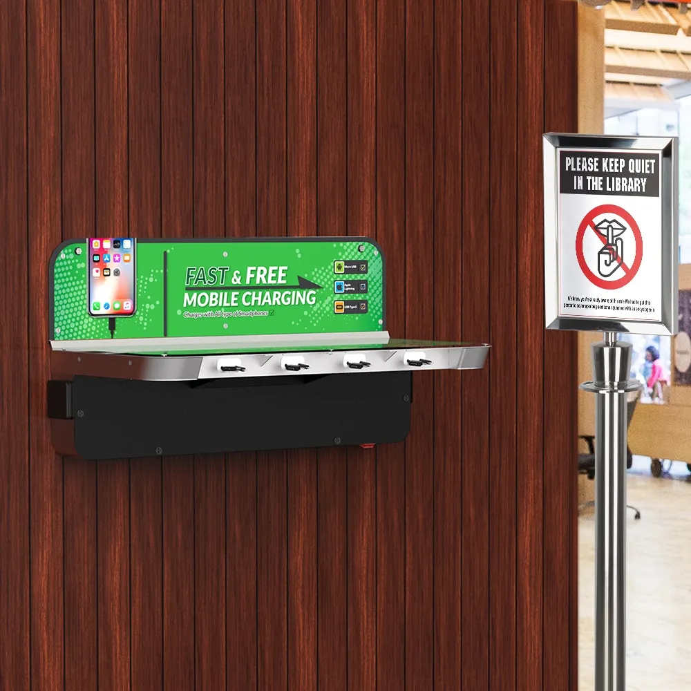 The mobile phone charging station also has a larger 680 x 164mm top header area where information, business logos, and graphics showing that free mobile charging is available to really get passersby attention. The wall mounted unit can charge up to (12) devices at the same time using the Qi pads, tamper-proof cords, and outlets on the each side of the unit that allow laptops power sources to be plugged in. There are (8) cables grouped in sets of (2) that each contain a Lightning cord and 2-in-1 Y cord with both USB-C and micro USB connectors. This wide range of connection types makes it easy to hook up many devices for charge, including Apple® and Android®.