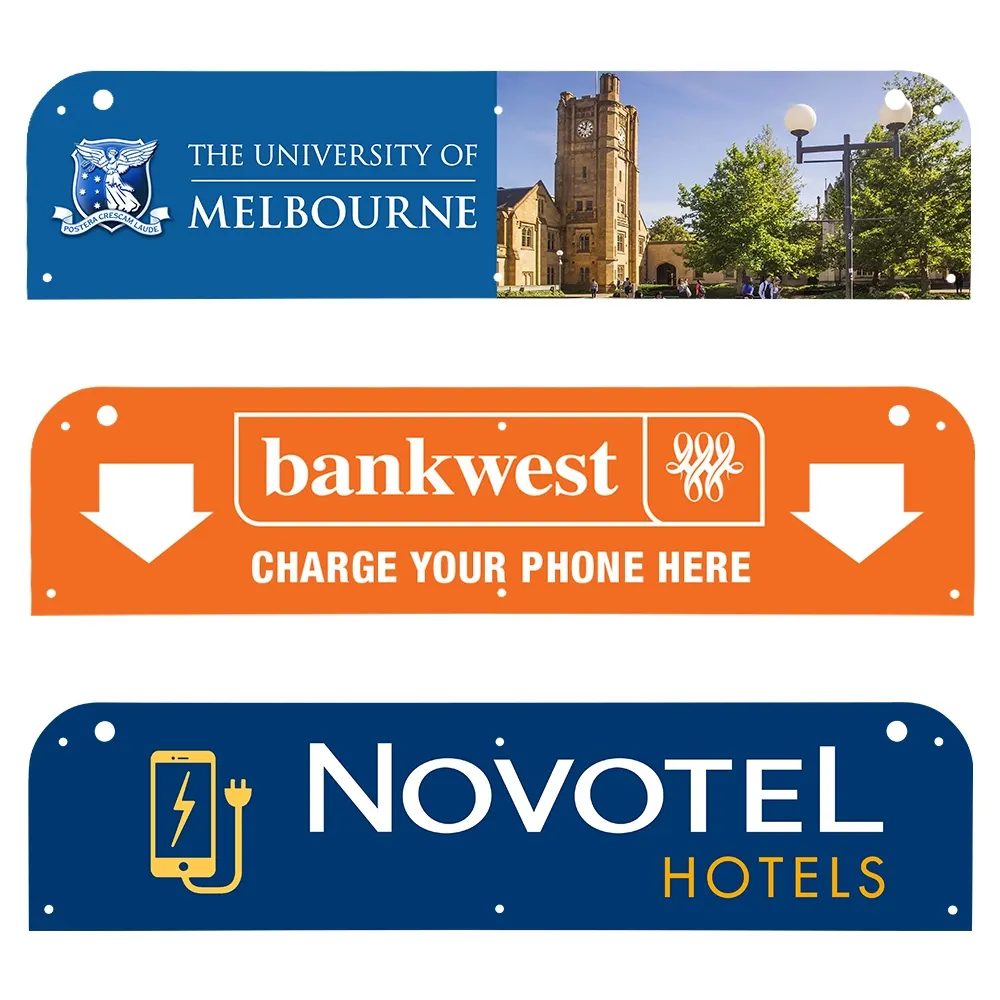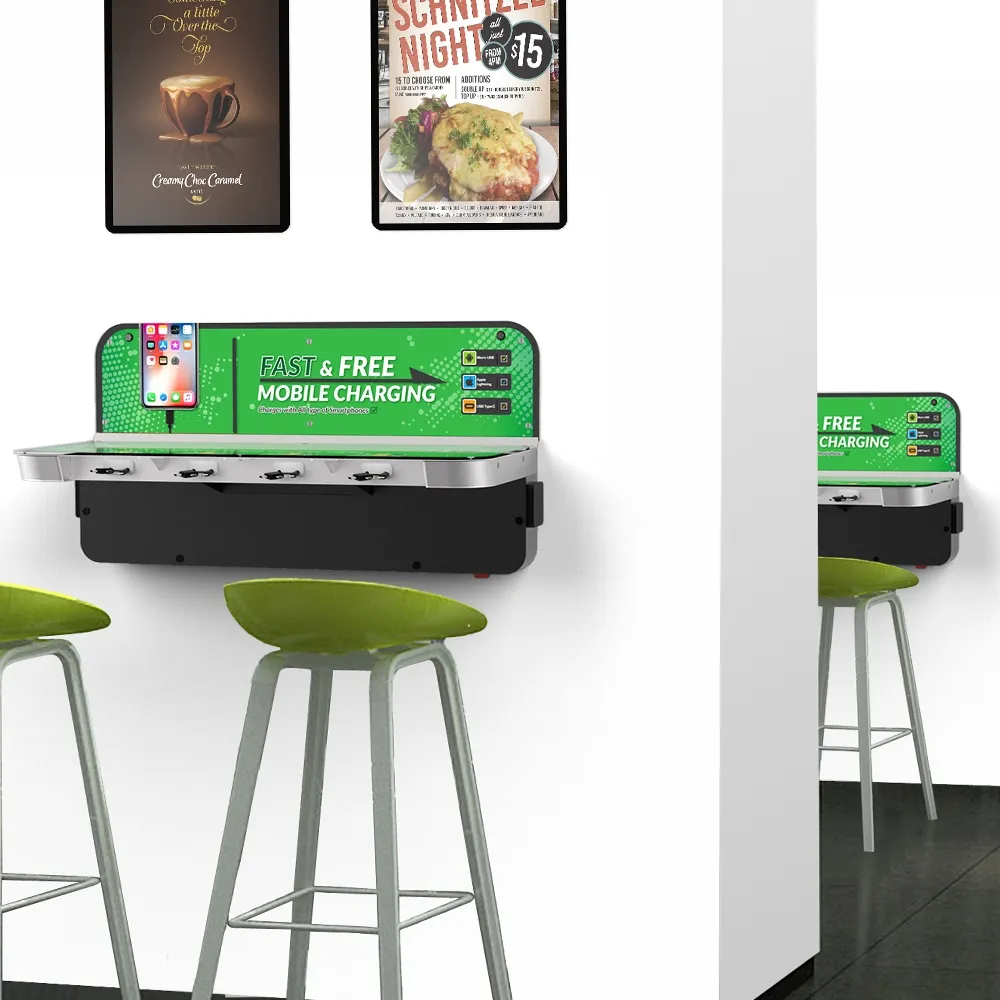 This mobile phone charging station is a wall mount unit with a large shelf surface area perfect for holding different phones, tablets, e-readers, and even laptops as they charge to give users a place to use and charge their device at the same time! The large 680 x 314mm offers heaps of space for devices, with (2) built-in Qi wireless charging pads allowing enabled devices to simply be placed on the surface. The surface features a custom printed graphic to match your colour scheme and design ideas, with the printing template showing where the Qi pads and locations of power cords are to properly label the areas within your design. Our in-house team is available to help with design options, with a range of packages to suit differing needs.
