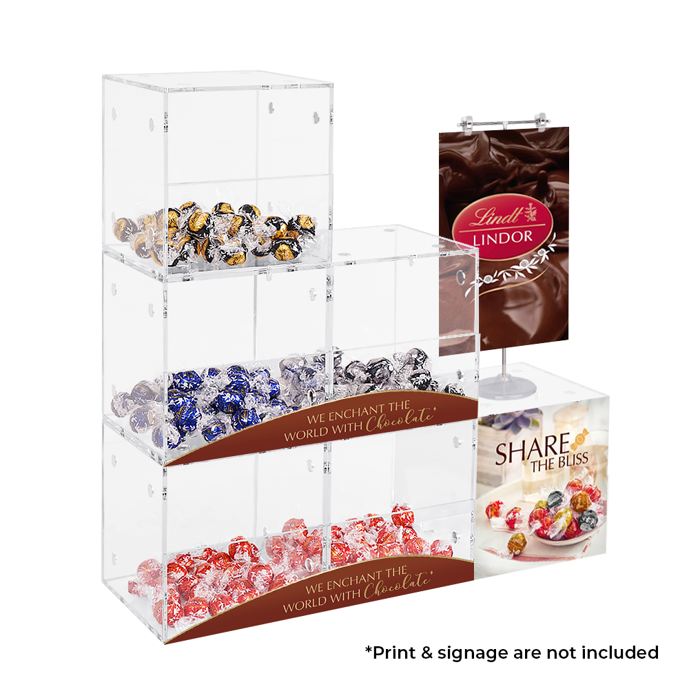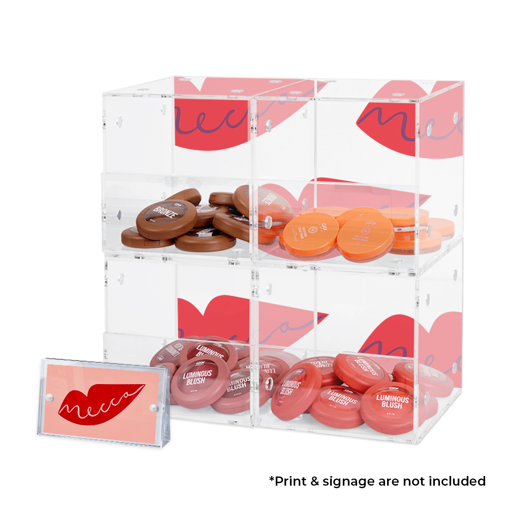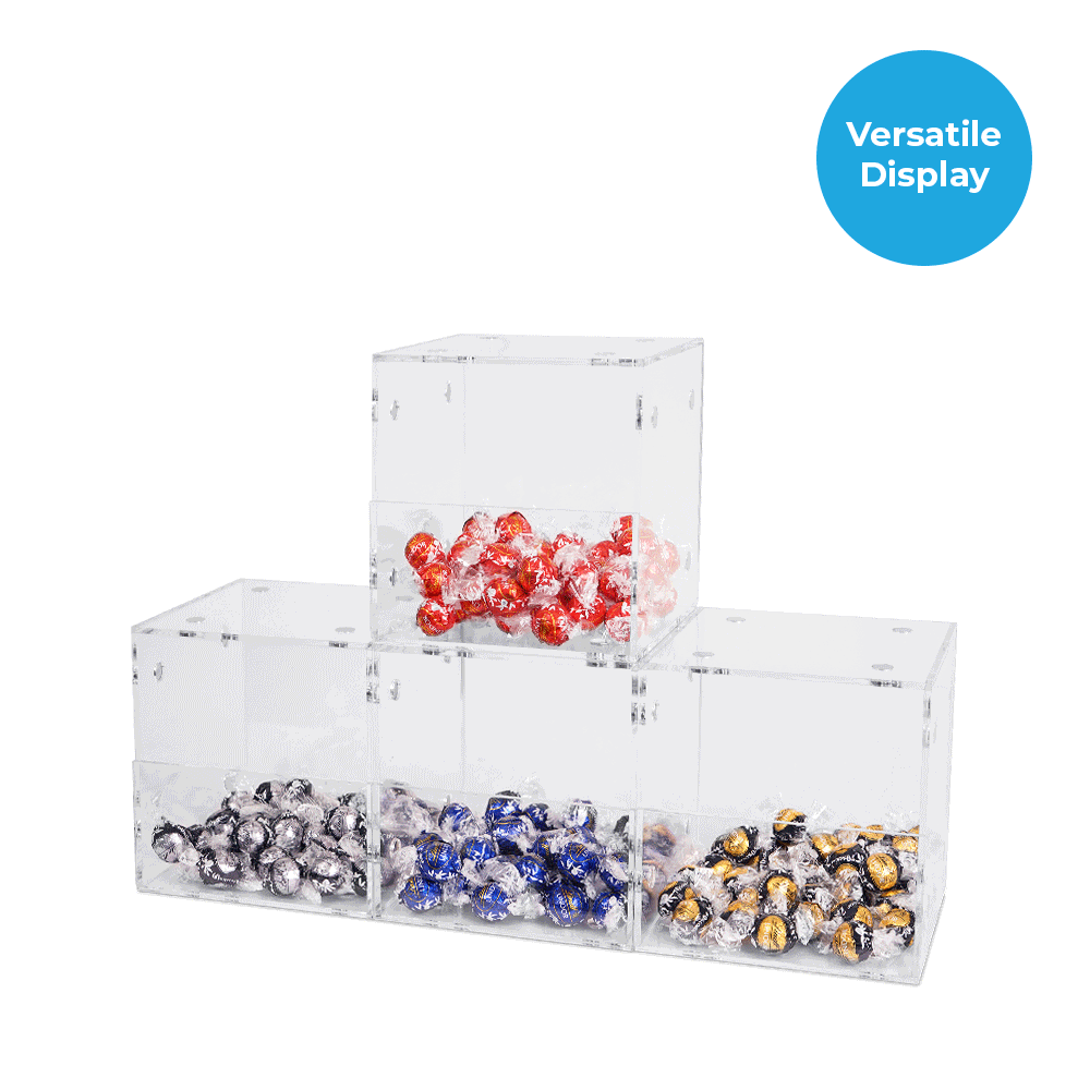 Lucite display cubes are a modular merchandising solution designed to help retailers maximise visual space and create more organised product presentations. Each clear acrylic cube is 200mm x 200mm x 205mm and constructed from 3mm thick panels for long-lasting use even in busy environments! Embedded magnets on each side makes it easy to connect multiple cubes securely, so you can stack them or arrange them side by side to suit your display needs. Changing the setup to work with different product lines is simple, with the magnetic sides allowing you to quickly reconfigure your layout at any time without tools necessary.