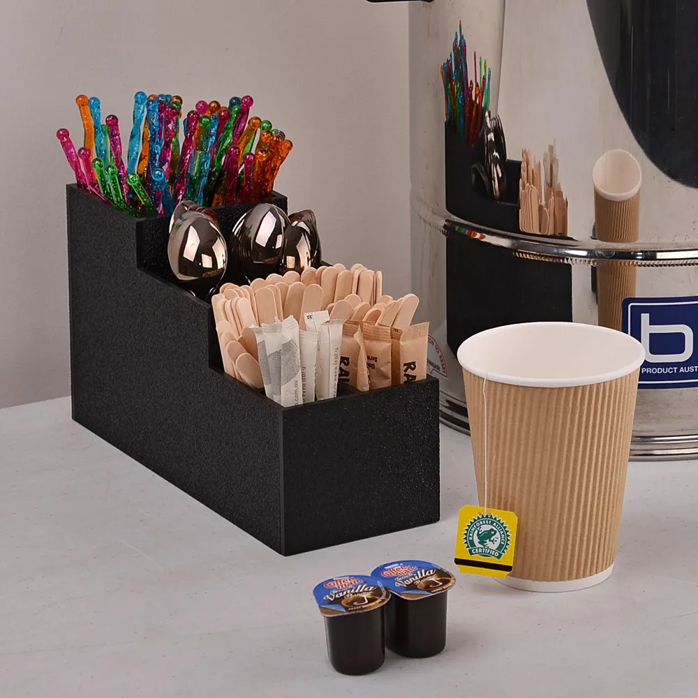 The coffee condiment organizer has a tiered design as well, keeping the stand compact and making accessing each level easy. Using minimal space can be essential in restaurant & hospitality supplies where you need to fit a wide variety of items for customer and employees to access. The display itself utilises durable black ABS plastic with a textured finish that holds up well with daily use.