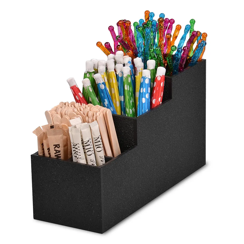 • Coffee condiment organizer features 5 pockets, holding straws, stirrers, & more!
