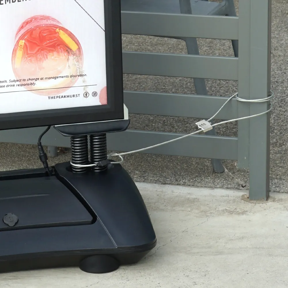 This 2m cable lock helps to secure signage in public areas to help deter theft. This style of security is great for A frame signs, poster stands, tablet displays, kiosks, and more that are placed in out of sight areas where theft is a possibility. The combination lock has (3) numbers for 1000 possibilities to make it harder to crack for would-be thieves whilst making it simple for you to have a number that you and your employees can remember. To set the combination on the lock, insert the cable head through the lock once in desired position and while holding the button set the number. Once released, remember to randomise the numbers and write the combination down somewhere away from the secured signage.