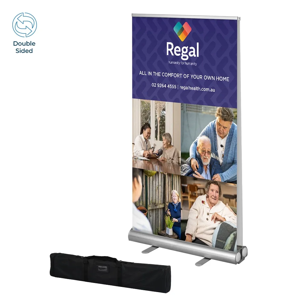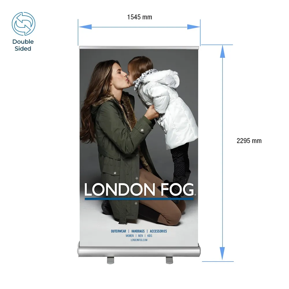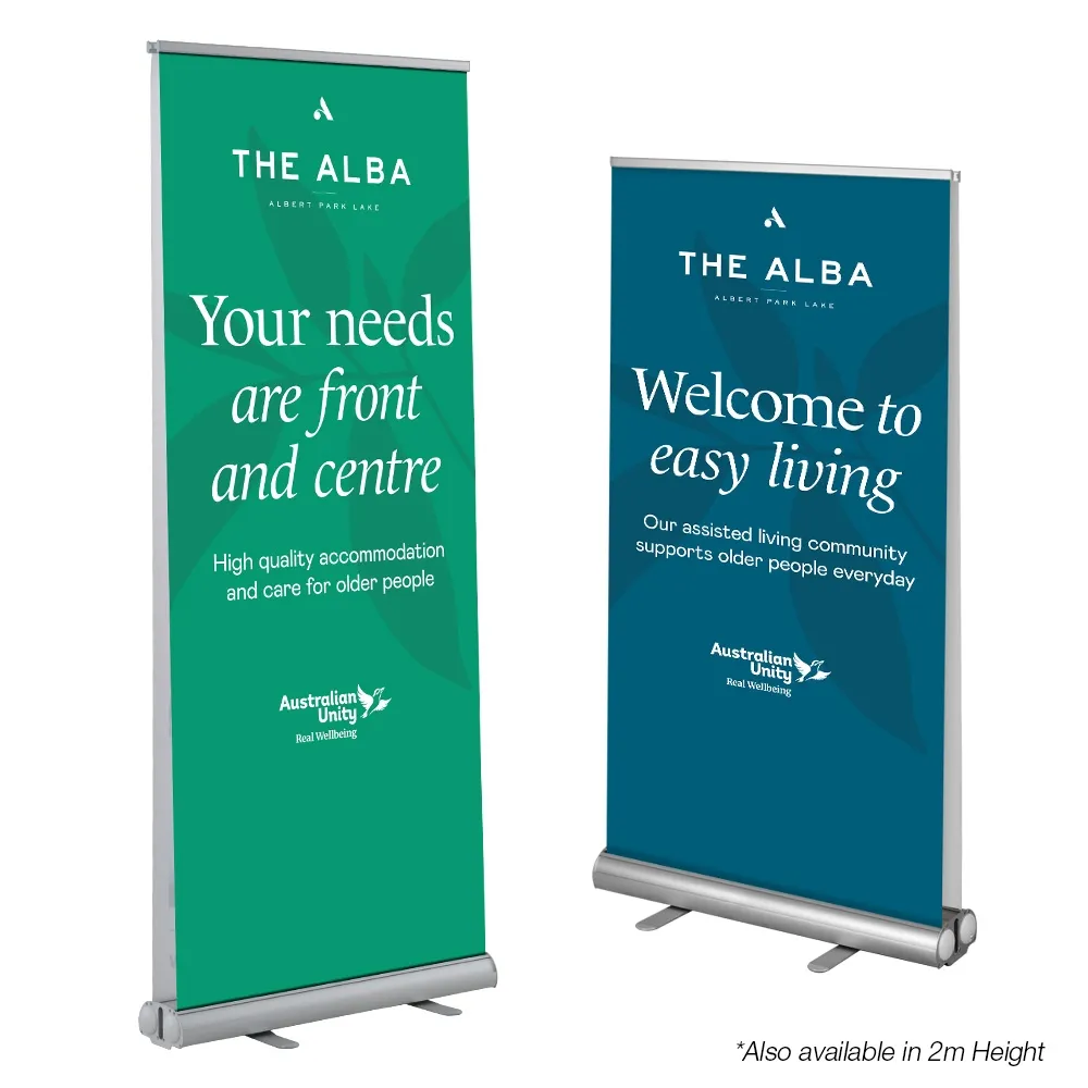 This retractable PVC banner is designed for use at shopping centres, with a fixed height of 1400mm as is required. These trade show pull up banners have a visible graphic area of 1350 x 850mm, providing plenty of space for your custom designed graphics, which are shown in vivid full colour due to the digital printing process! This lightweight retractable PVC banner is made from aluminium, offering a durable display with the silver finish working well within any décor! Retractable PVC banner is a portable display, with included carrying bag helping with transport.