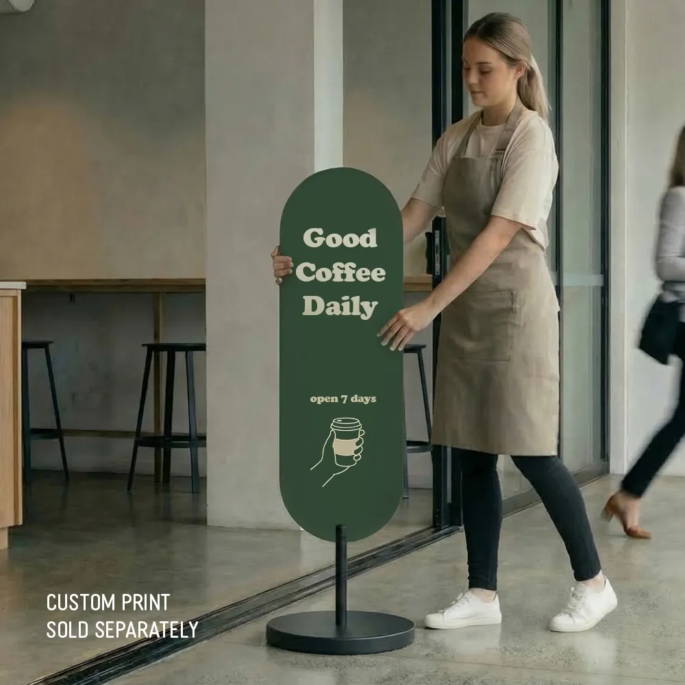 The compact, weighted base keeps access paths clear in shopping centres, malls and shopfronts. This oval branding stand suits locations where permanent signage is not allowed. Powder-coated steel construction supports reliable indoor or outdoor use. The modern oval sign display blends easily with contemporary fit-outs and avoids the visual noise of traditional A-frames.