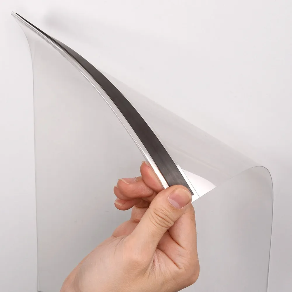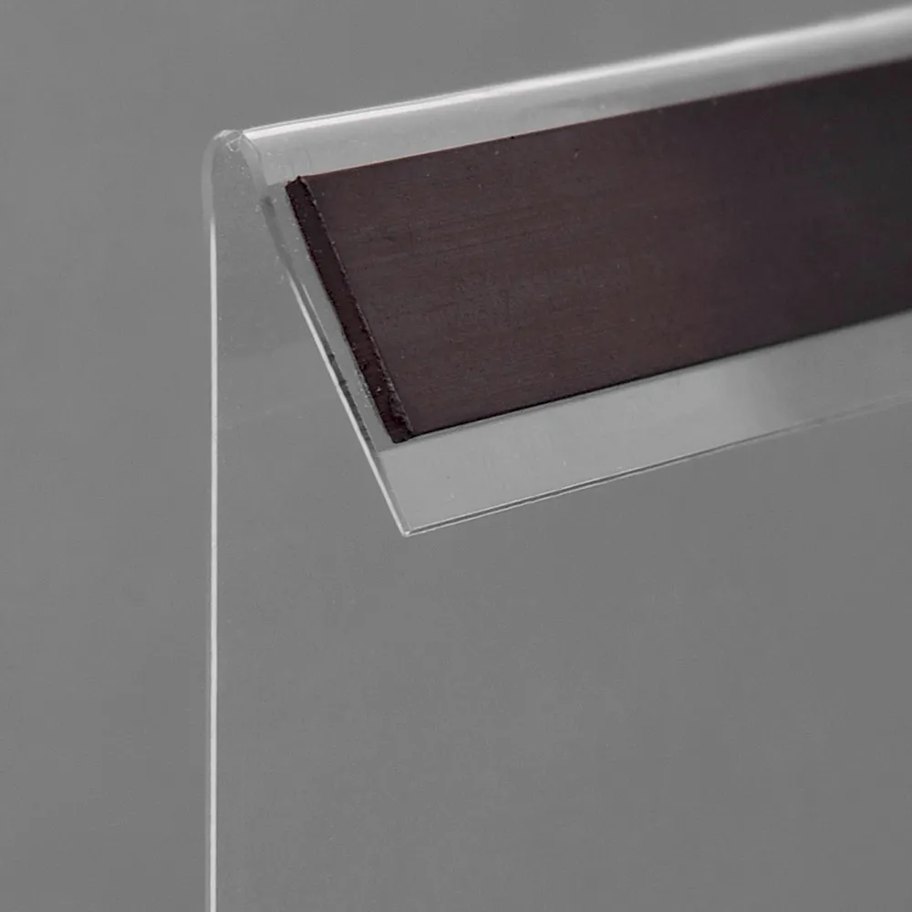 The retail signage display, magnetic poster holder are made of clear flexible plastic, offering a full view of posters during display. The holder has (2) magnetic strips on the back to adhere to most metallic surfaces. This style means you have a non-permanent display that can be put where you need it around your business during any changes. The folded top and bottom of the display near the magnetic strip keeps graphic securely in place.