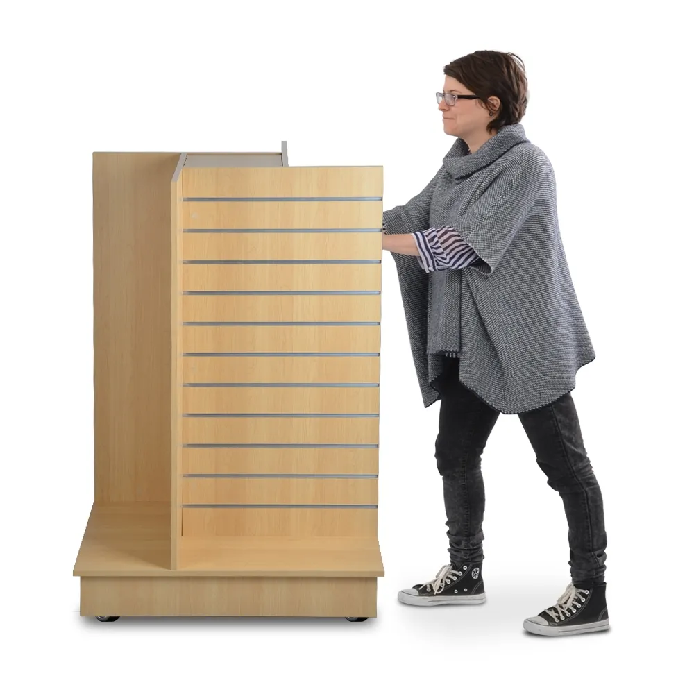 - (4) wheels on (2) MDF boards turn existing slatwall display into movable unit