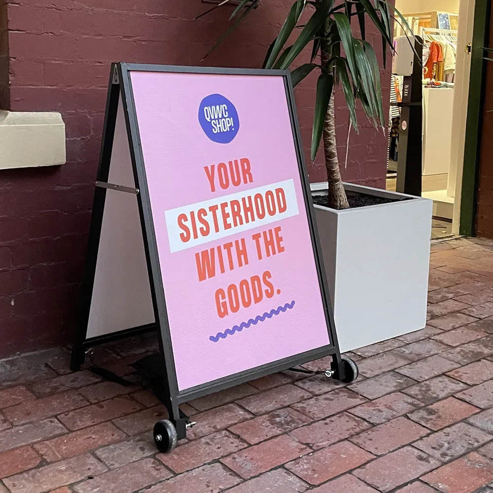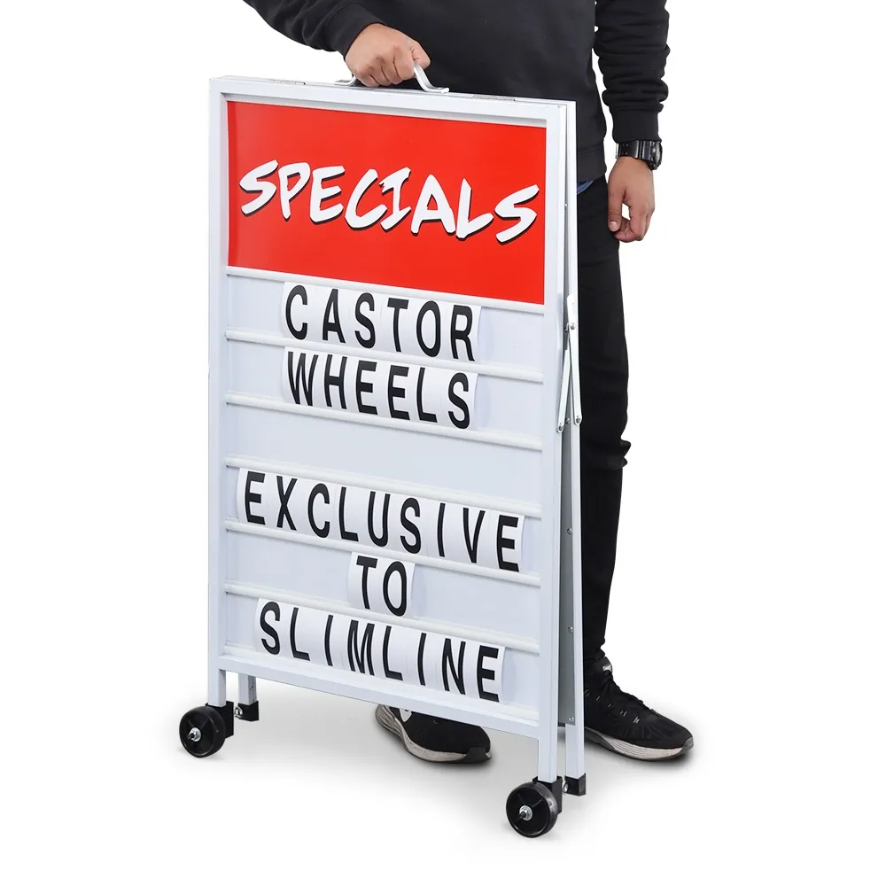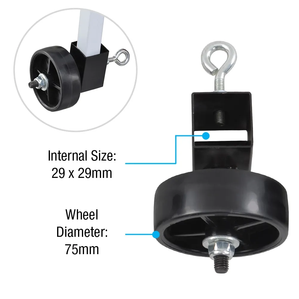 The wheel kit for sandwich boards, great for our line of pavement signs, connect to the legs using black steel tubes. You can attach the wheels to rounded or squared legs up to 29mm in overall thickness, with the eye-hook tightening to ensure the unit stays in place during use. These eye-hooks are useful not just for tightening against the leg, but also for utilising straps for attaching weighted bags for an extra layer of stability. Order today by 3pm EST for same day Australia-wide despatch with this and most other in stock products, only from Slimline Warehouse!