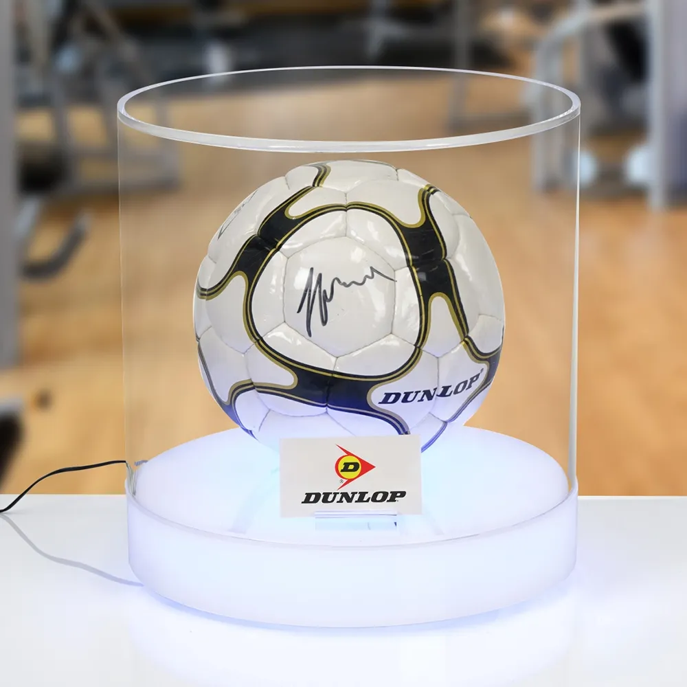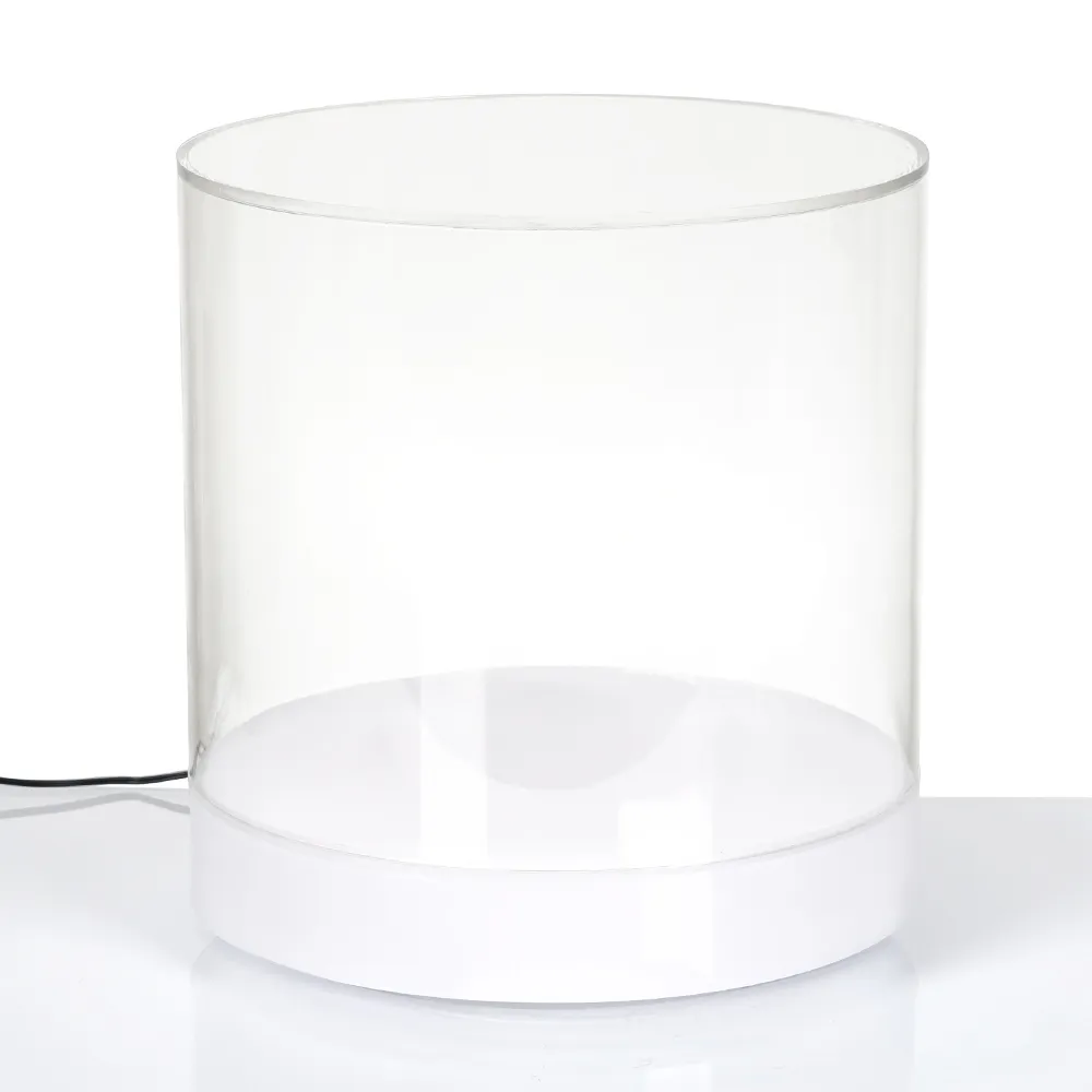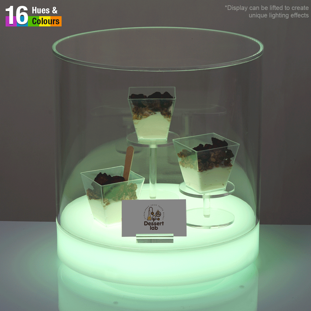 An acrylic display case with LED lights, like a round showcase, has a clear plastic cover that provides a full view of on display items whilst also reflecting the light for a spectacular look. The 5mm thick clear perspex covering is durable and lightweight, designed to fit onto the base with indentations to keep it from sliding off. The 310mm diameter showcase is designed for countertop use, easily fitting onto a table whilst providing space for other cases or informational stands to be displayed beside the unit. The interior provides 285 x 245 x 285mm of space to hold a variety of items and their holders without issue.
