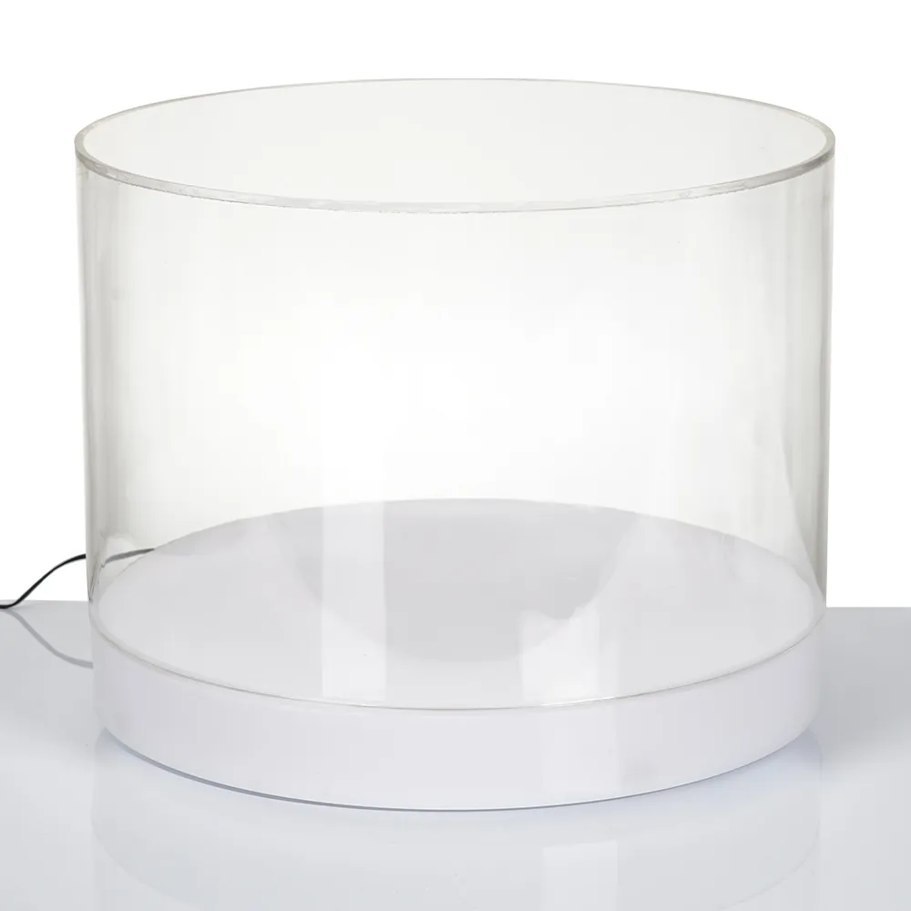 A round acrylic display case, like many lighted showcases, uses a clear cover made from 5mm thick perspex that provides a full view of on display items whilst protecting them from gathering grime and dust. There is an indentation around the base that keeps the cover from slipping off and in place during use. This showcase has a 400mm diameter to hold a range of item sizes on a countertop without taking up heaps of space. The interior is designed to hold smaller items that fit within the 390 x 245 x 390mm size, easily accommodating a wide range of goods and their stands.