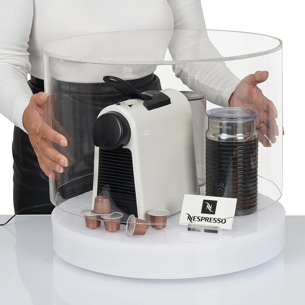 - Round acrylic display case has LED base to illuminate items with 16 colours & hues