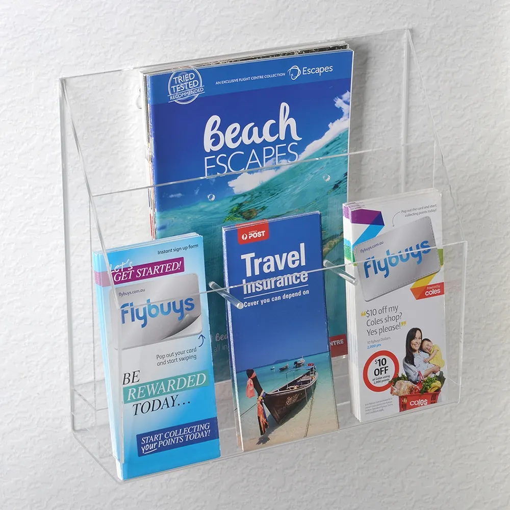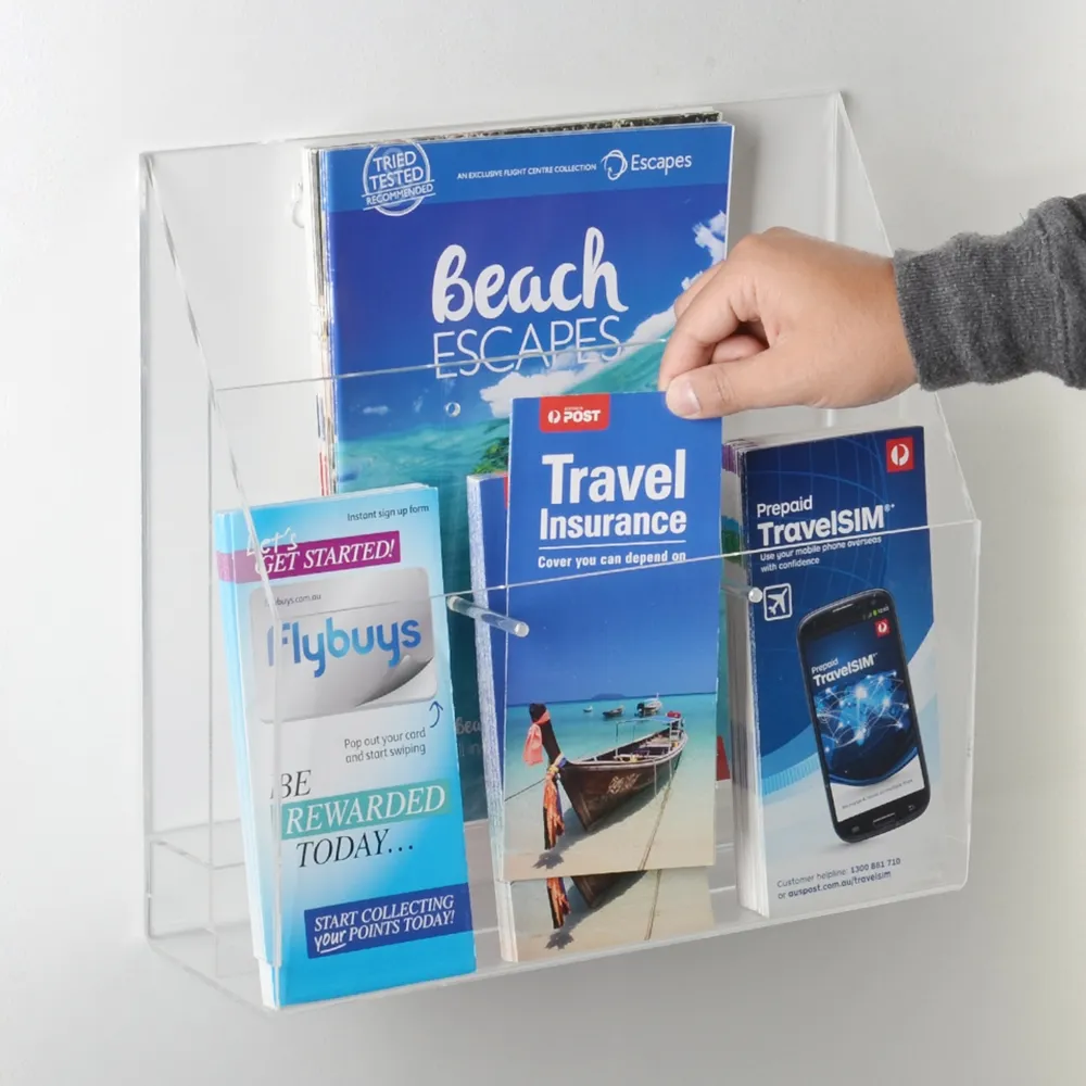 The acrylic brochure holders wall mounted, like other plastic flyer dispensers, are designed to display multiple sizes of literature to allow your location to provide the exact styles you need. Place DL (99 x 210mm) or A4 (210 x 297mm) within tier, with pockets able to be configured as needed using the removable dividers mentioned above. Each level can be divided into maximum 3 pockets for DL display for a total display of 6, and any combination of less than six when using other sizes of literature.