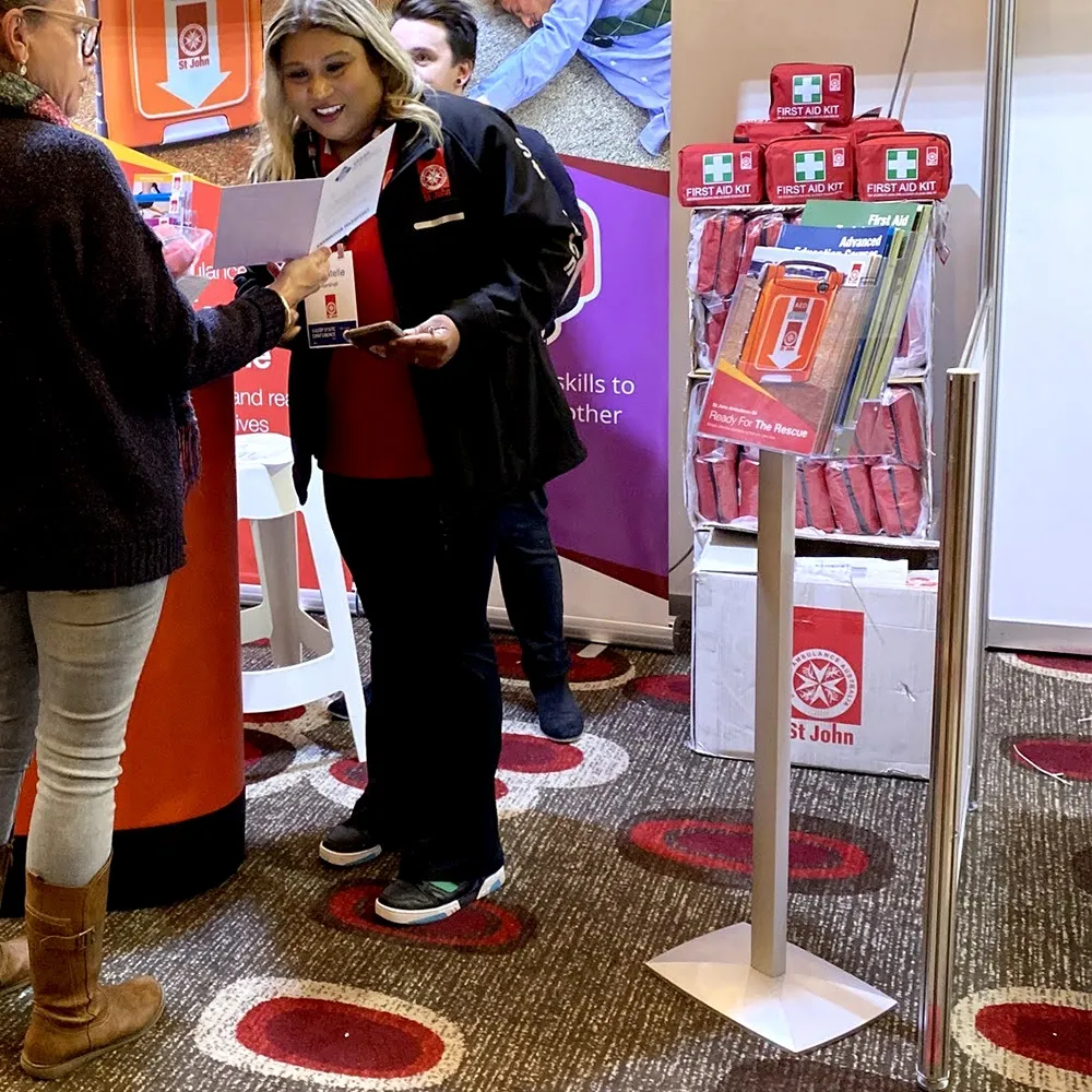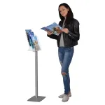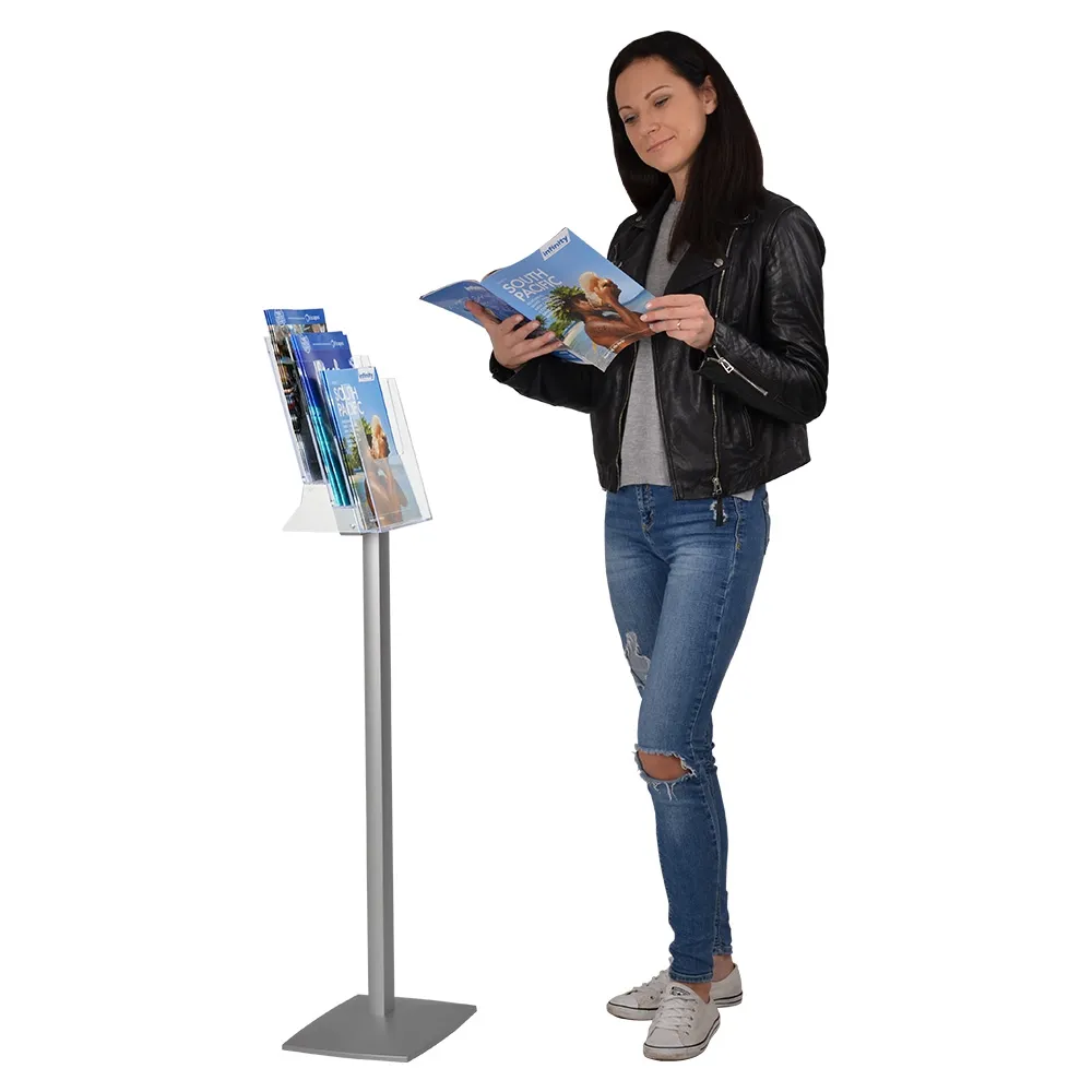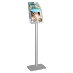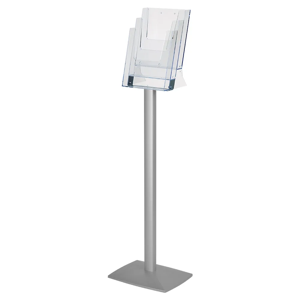 The floor standing brochure display, 3 tier literature holder uses clear injection moulded plastic to create each of the pockets, offering full side views of all presented materials, with items placed in the front also having a full front view. A notch in the pocket makes it easy for visitors to remove the displayed literature as well. The stand is shipped flat to lower shipping costs, with assembly only taking a few minutes using simple tools.