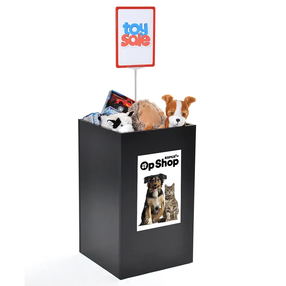 These promotional dump bins are perfect for retail stores, pharmacies, post offices, expos, markets and more to place bulk items for easy browsing! This retail dump bin uses an adjustable height centre shelf to make displaying a variety of items simple. There are four depths to choose from, including even with the top to create a plinth for hero product display! The other (3) depths are 250, 450, and 712mm from the top of the 750mm display, with interior pegs easily moved into pre-drilled holes to place at desired height.