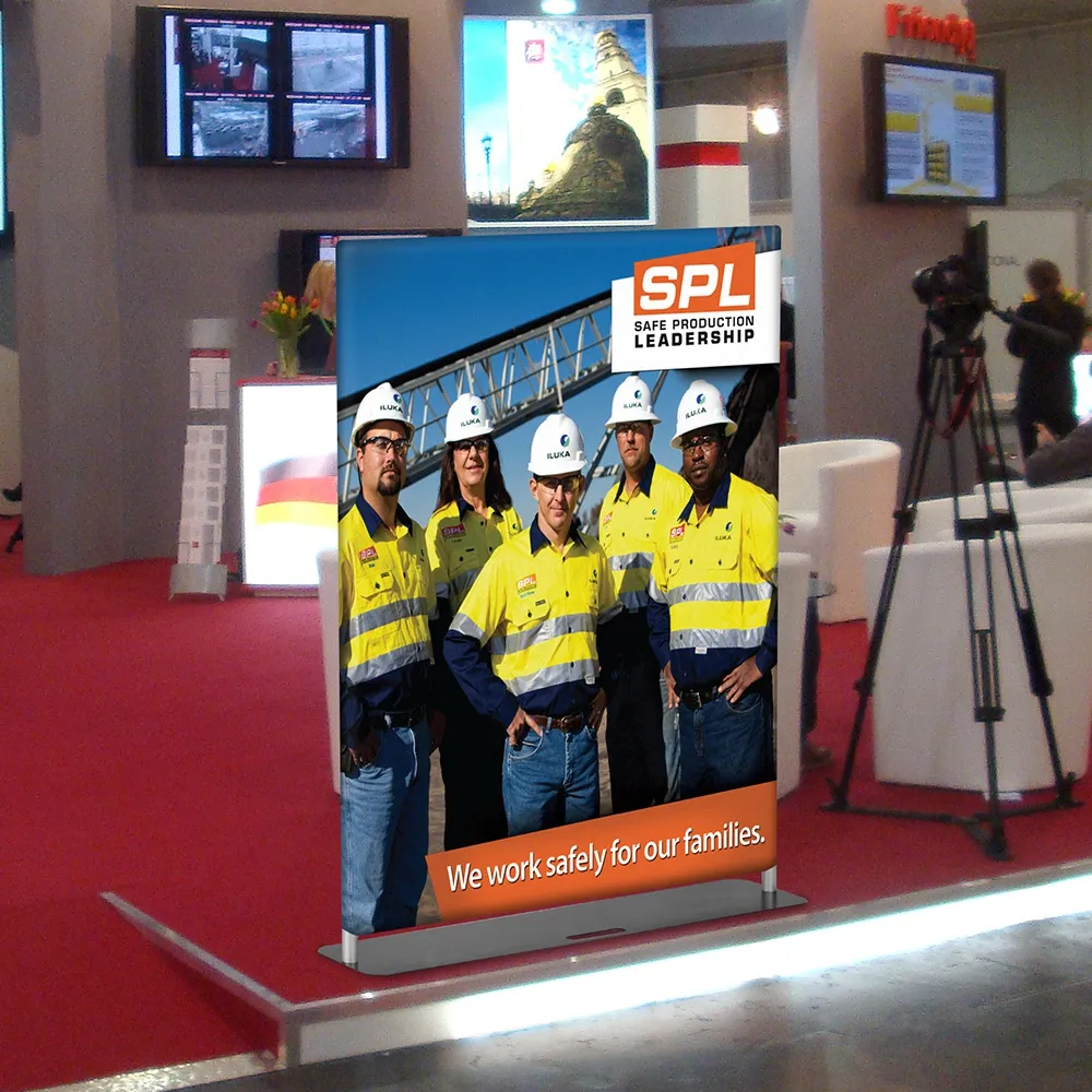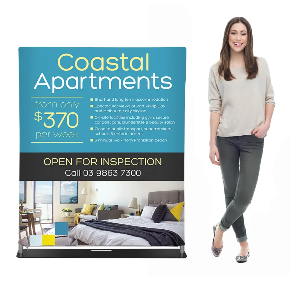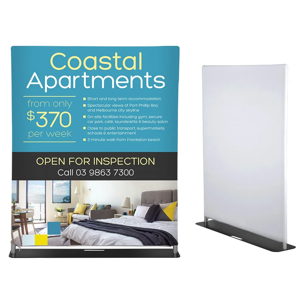 This tension banner stand, like a trade show displays, features a 1220 x 1500mm fabric wrap that shows your custom designed advertising to really capture attention. A digital printing process using dye-sublimation depicts your designs in vivid full colour, helping attract potential customers and get them interested. The stretch fabric wrap has a zipper to easily put the graphic around the aluminium frame as well, pulled taut for a professional look.