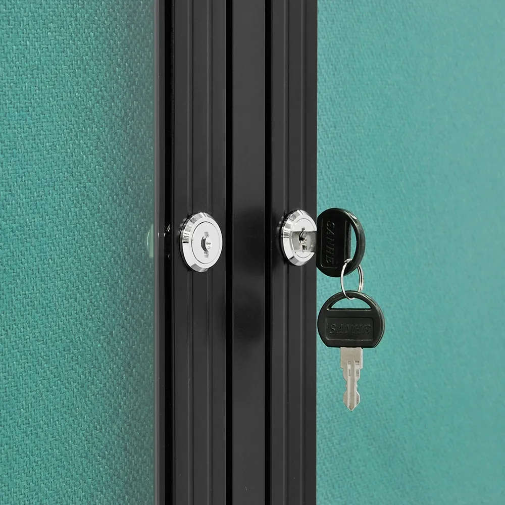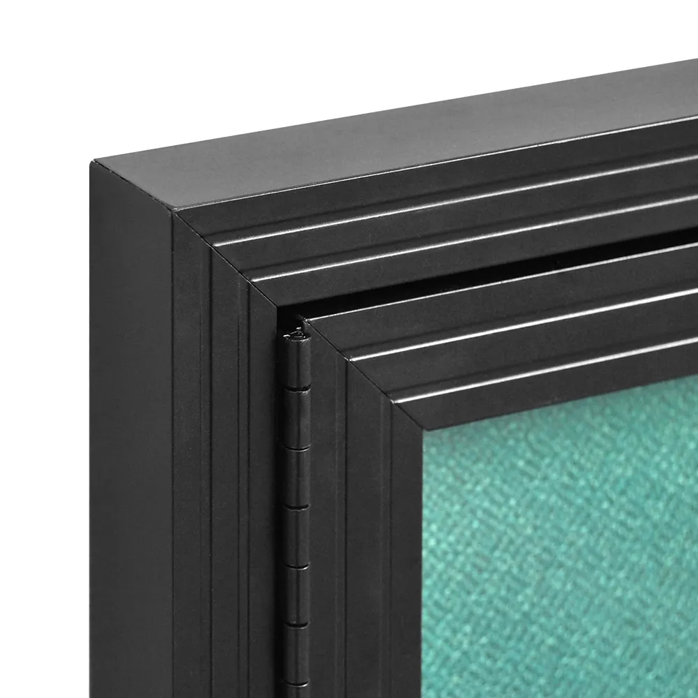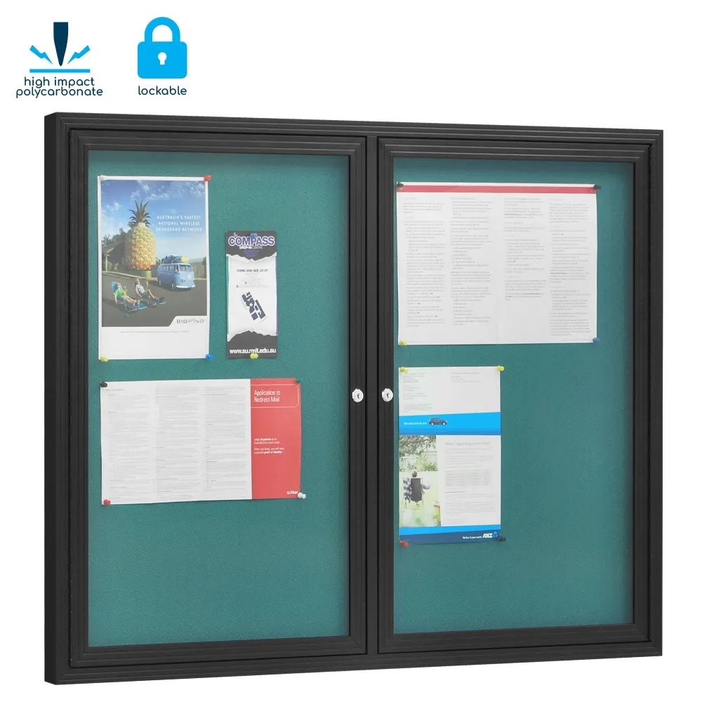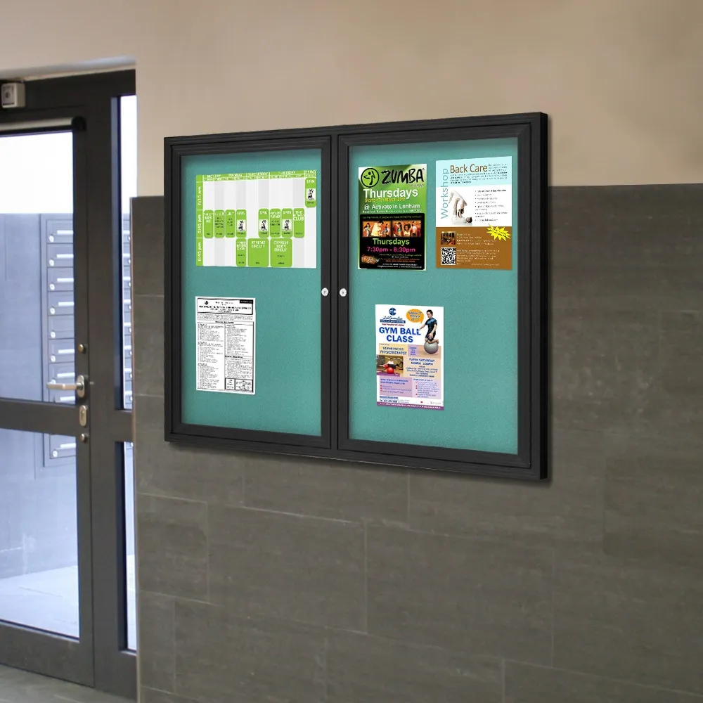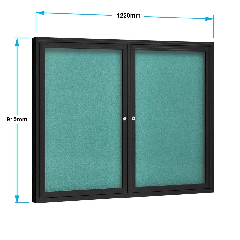 This fabric pin board is used in many indoor locations indoors for displaying notices, announcements, posters, and other information in public areas for passersby to see. The tackboard has an attractive woven teal fabric board, with a 840 x 555mm usable area behind each door to provide ample space for placing these memos in the display using tacks.