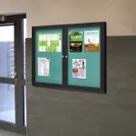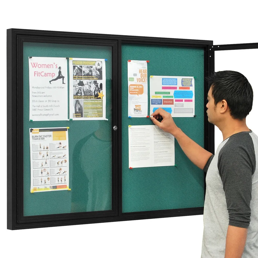 A fabric pin board, also known as a glass message board and a tackboard, has polycarbonate doors that are shatter resistant, providing a safe durable display. These swinging doors access each side individually, so you don't have to open the entire display to replace graphics on only one side. This fabric pinboard can have notices changes quickly, with it only taking seconds to switch out posters on the self-healing corkboard.