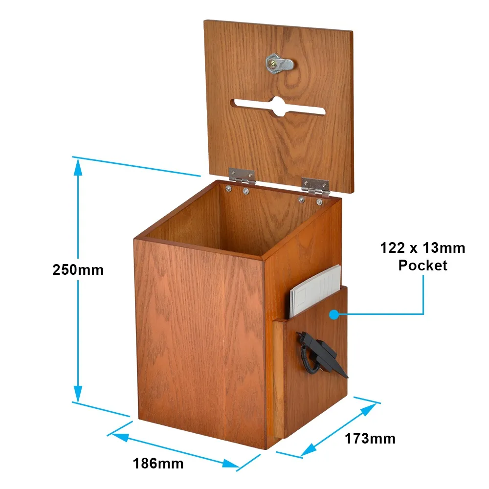 A wooden ballot box with lock, like a charity box, is made from wood with a light oak finish for a durable box that fits in with the décor of any location. This box includes a side pocket that can hold cards, envelopes, or other items up to A6 (110 x 148mm) in size to provide visitor with what they need. There is also a security pen included that attaches to the side of the box to give an easy way to fill out information on the provided items in the side pocket.