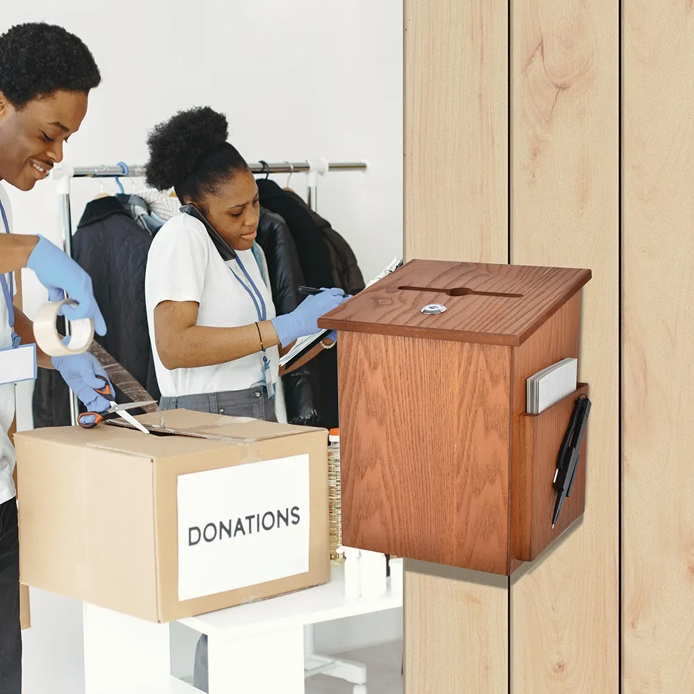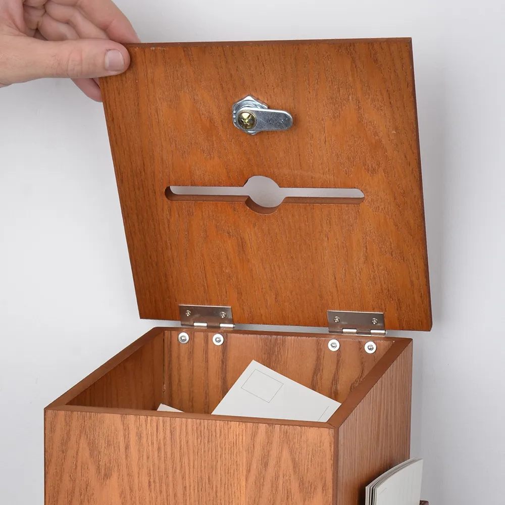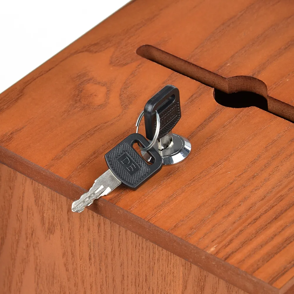 This wooden ballot box with lock helps you to collect comments, votes, suggestions, and even donations using a secure container. This suggestion box features a locking top with hidden hinges to protect items placed inside from tampering or theft. A set of two keys is included to provide access to holders at your church, office, restaurant, school, or other business.