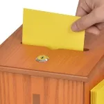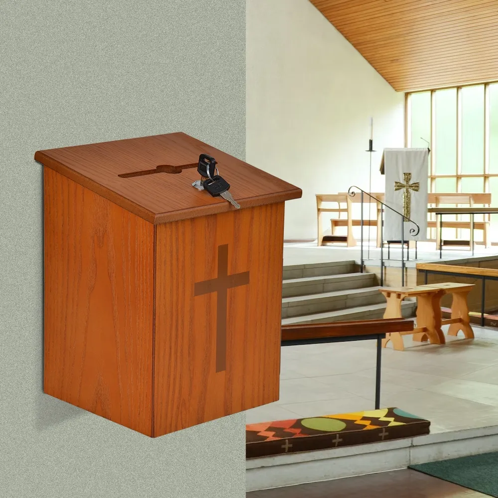 This wood church donation box provides a safe container for the collection of money for charity, service, tithing, and more. The locked suggestion boxes are made from wood with an oak finish and feature a cross on the front. The durable wooden design ensures long lasting use in all applications, with the light oak finish fitting in perfectly with a variety of different settings.