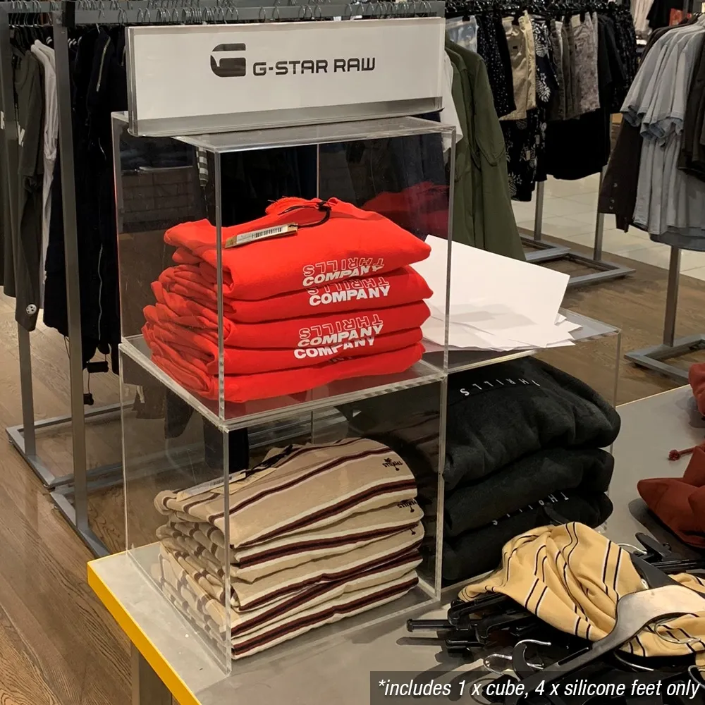 This acrylic display, clear perspex box also includes a set of (4) silicon feet that you attach to the side of the cube that you will have on the table or counter. These feet have a diameter of 11mm and a height of 4mm to only slightly raise the box up whilst still offering protection to stop the bin from getting scratched. This plastic display cube is a great addition to any retail store thanks to it's versatility, low-price, and great look. Order today by 3pm AEST to receive same day shipping with this and most other in stock products to anywhere in Australia, only from Slimline Warehouse!