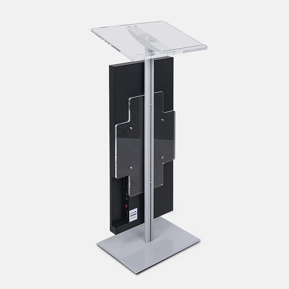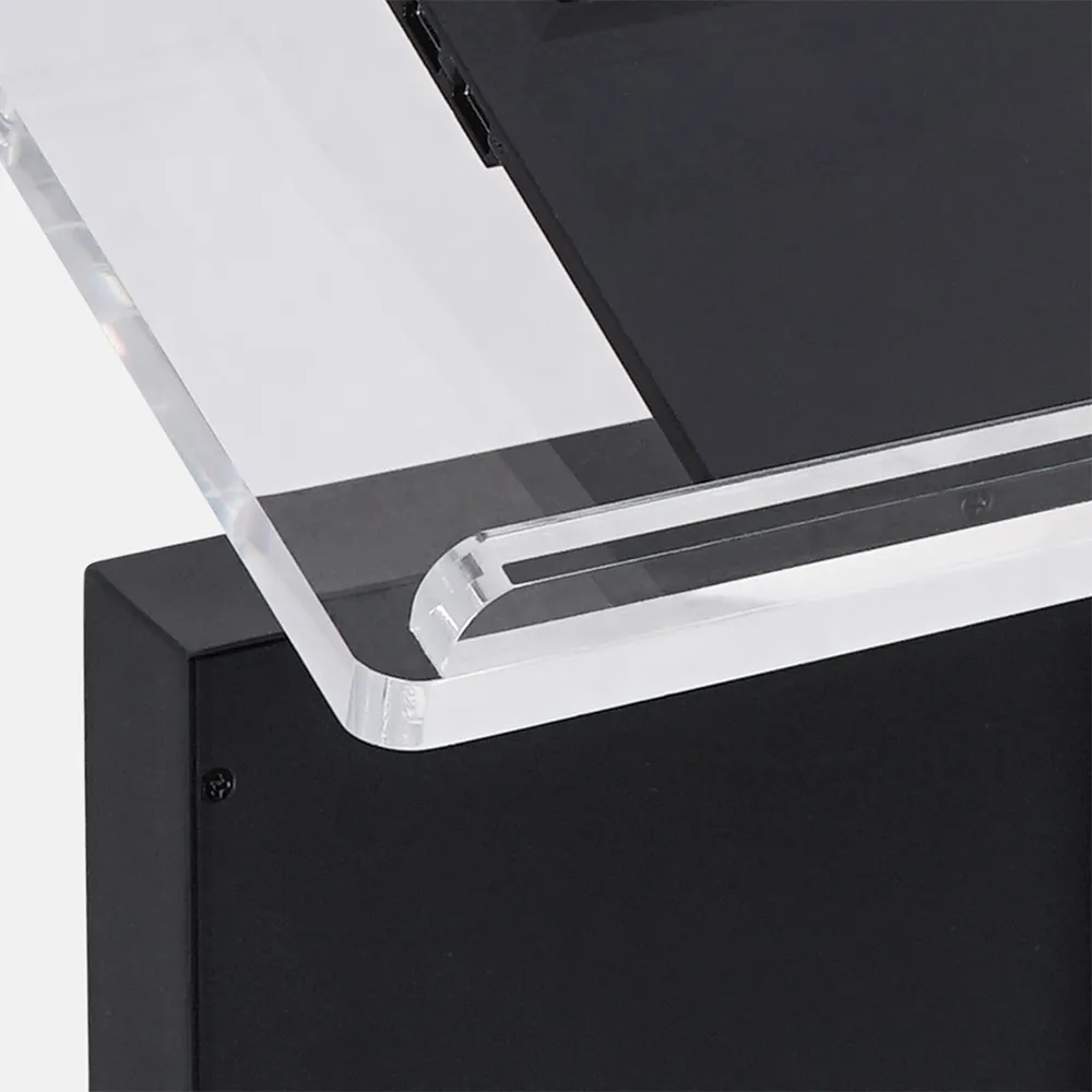 The lectern with screen, like other digital podiums, is designed for daily commercial use with an operating time of up to 18 hours per day. This makes it an excellent choice for busy venues and extended events over standard screens. The top acrylic surface of the podium measures 470 x 320mm, providing enough space for a laptop, notes, or tablet with a maximum load of 15kg. The lip at the bottom is 12mm tall to help keep all materials in place, and the tilted top ensures all items are presented at an easy to read angle.