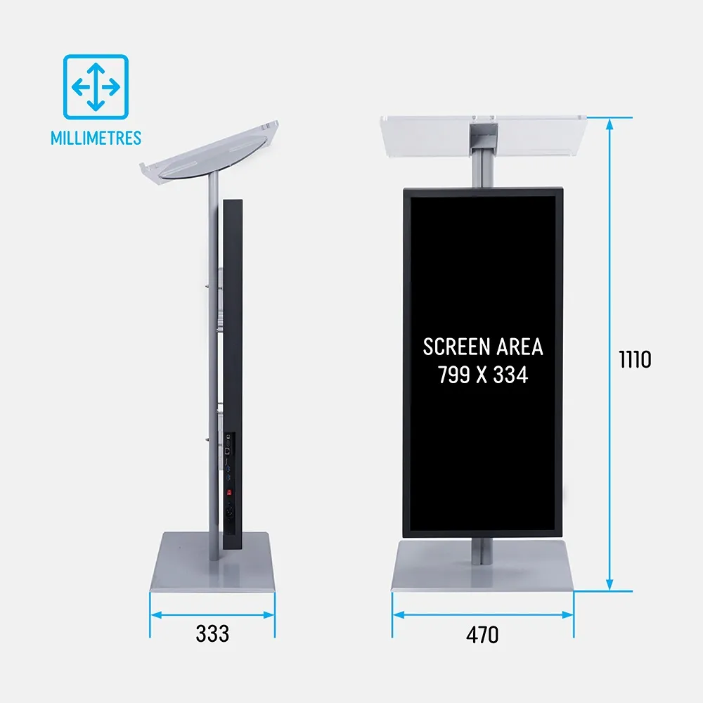 The 470 x 333mm base ensures a stable display during use, with a matching silver finish to the rest of the stand and bevelled edges for a truly professional look. The 1115mm tall display allows speakers of different height to easily present at any event. This style of rostrum helps cut down on costs and is environmentally conscious, as new posters will no longer be needed for each event. The bright LCD screen also helps to better draw attention and allows for my eye-catching branding to be used. Slimline Warehouse ships Australia-wide with fast dispatch, buy online today for quick shipping nationwide!
