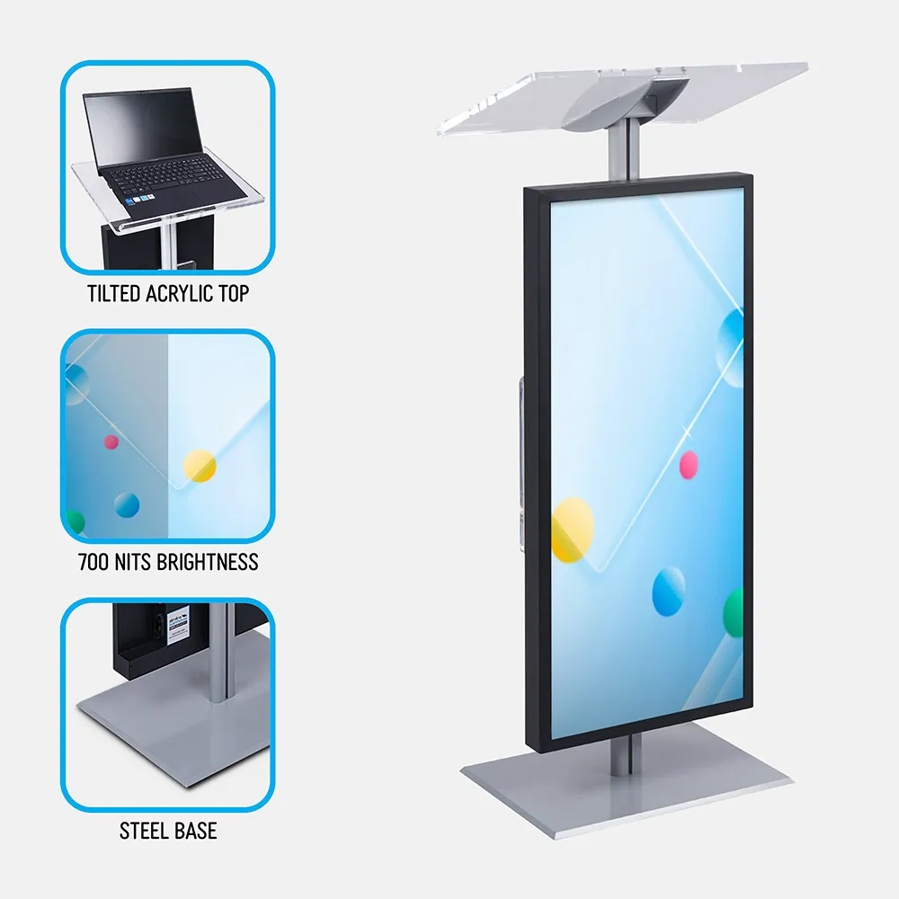 • Lectern with screen includes a 34” commercial-grade LCD for dynamic branding and presentations