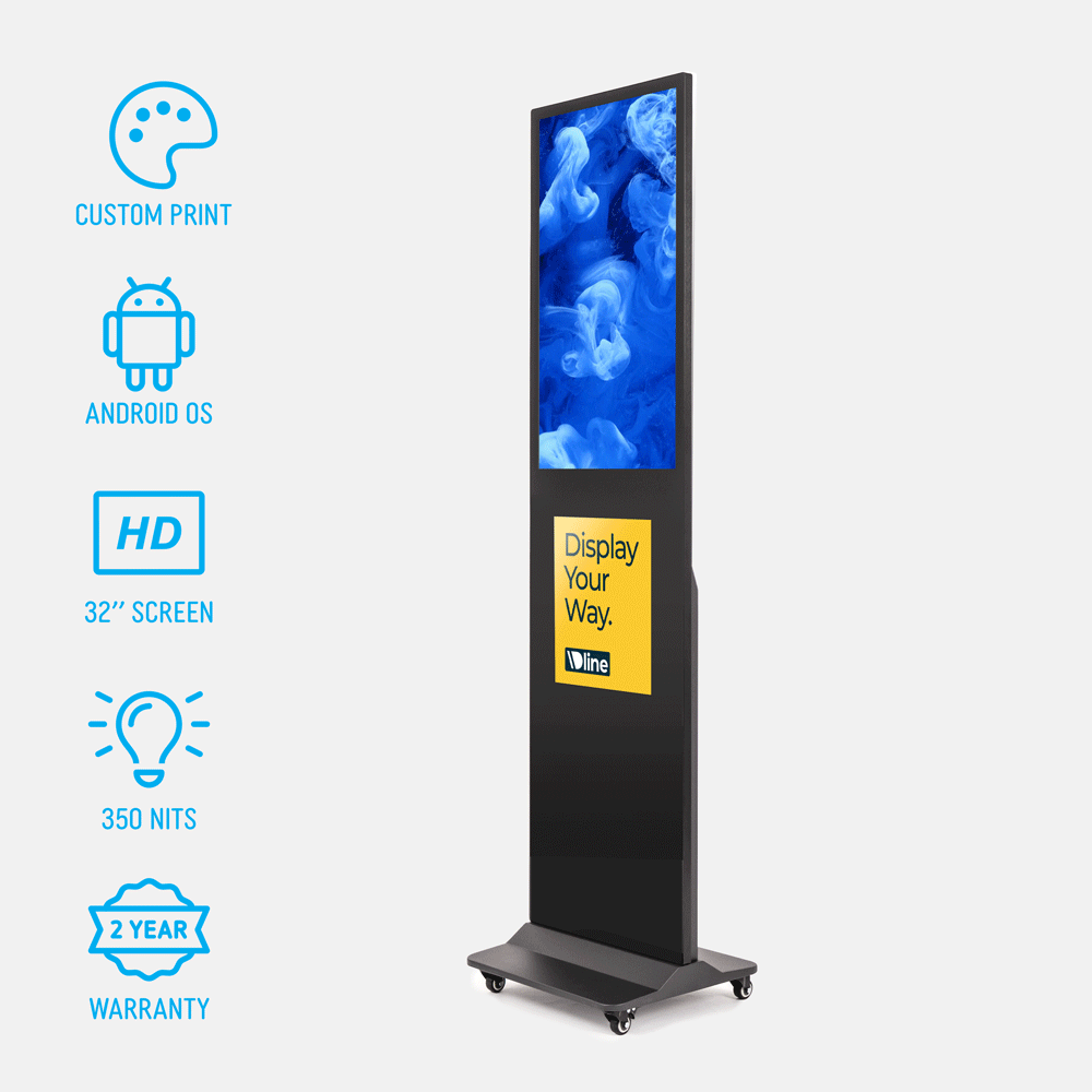 This 32 inch digital signage display gives businesses a fast, flexible way to update messages. The commercial-grade panel provides clear visibility for menus, promotions and visitor notices. Motion graphics cut through visual clutter in busy retail, hospitality and public spaces. The freestanding design suits high-traffic environments where quick changes are essential.