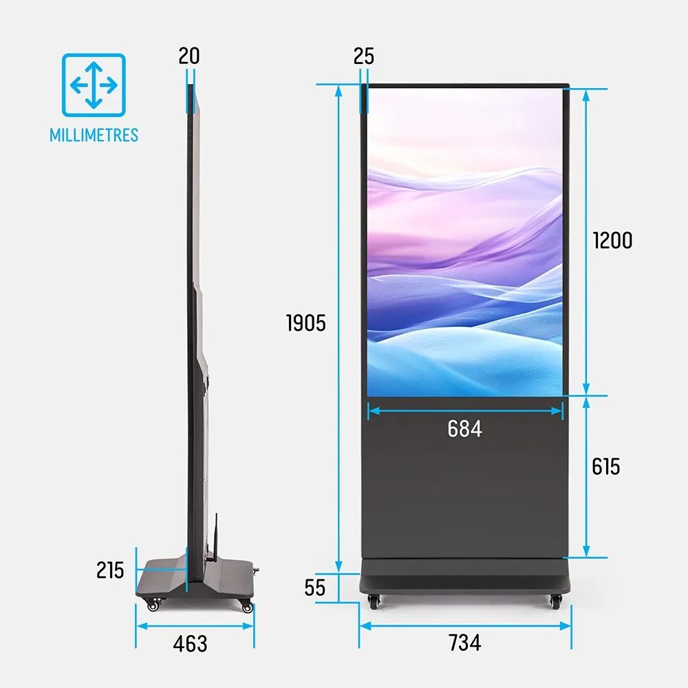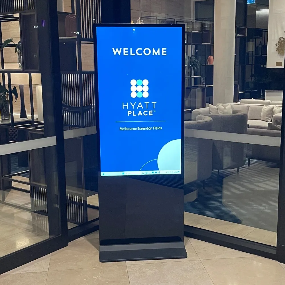 These 55 inch digital signage displays delivers strong, high-visibility communication in retail, hospitality and public spaces. The commercial-grade display presents promotions, announcements and animated content clearly in shopping centres, pharmacies, airports and hotel lobbies. Its freestanding structure and tall profile stand out in wide concourses and busy venue foyers.