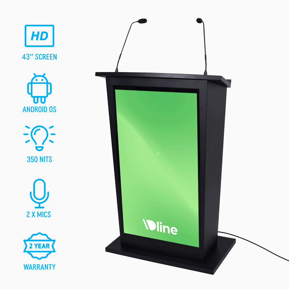 This LCD digital display lectern features a full HD screen and a full multimedia set-up for a modern, smart podium that brings conference centres, corporate events, trade shows, lecture halls, and more to the next level. The integrated 43” digital signage screen is powered by Android® 11 OS for compatibility with a broad range of Apps and media formats, including video, image, and audio files. With a full HD resolution of 1920 x 1080, 350 nits brightness, and a 178° viewing angle, this digital signage display provides a sharp visual presentation that is visible in different lighting conditions and whatever an audience member is sitting. Dual 8-watt built-in speakers are ideal to provide audio support for the screen. There is 32GB of internal storage and 2GB RAM, holding heaps of content with a quad-core processor for smooth playback. Users can upload content via USB, TF card, Ethernet, Wi-Fi, or cloud-based platforms. A remote control is included to help navigate settings and applications with ease.