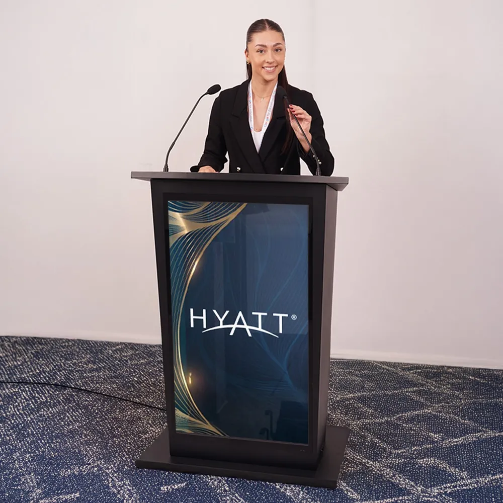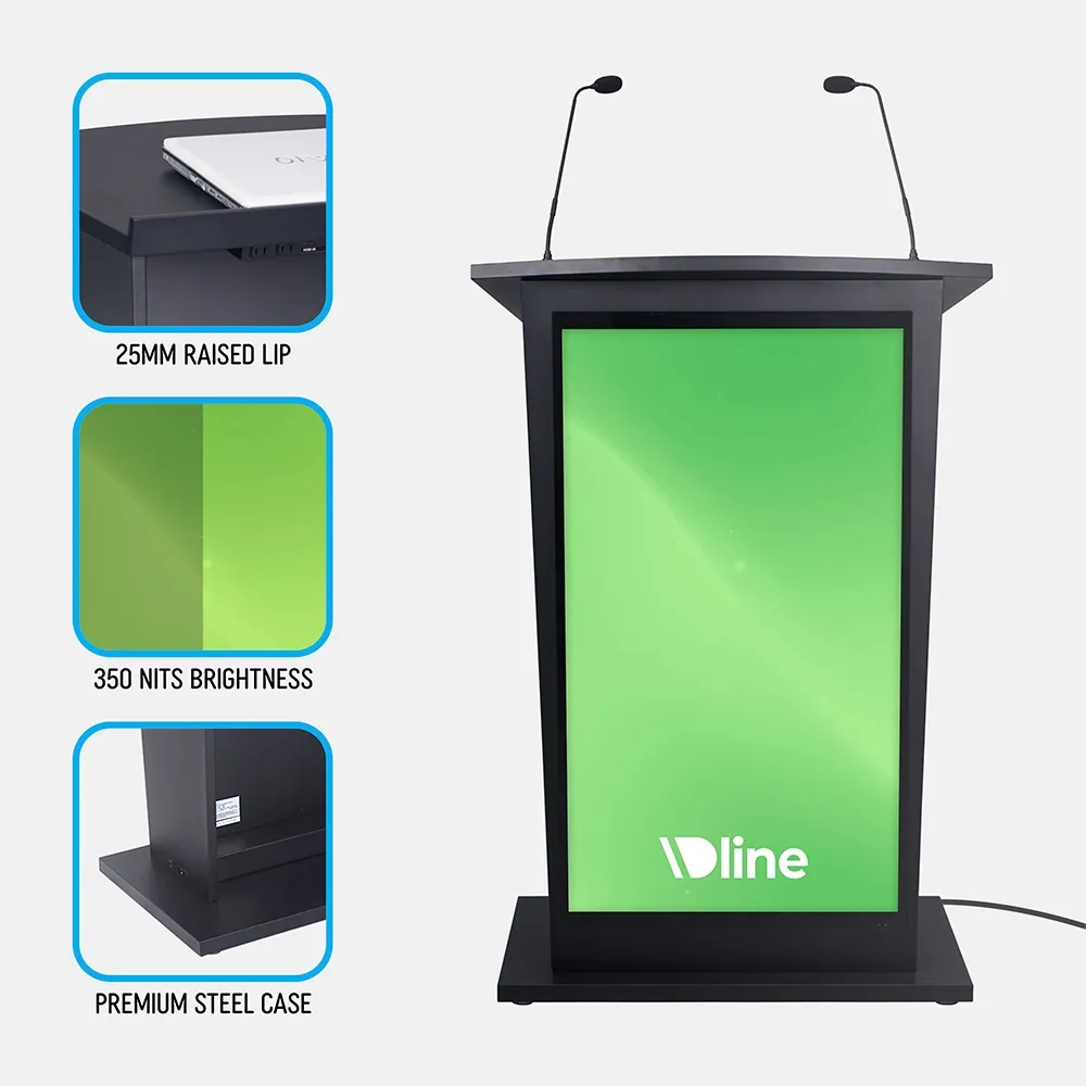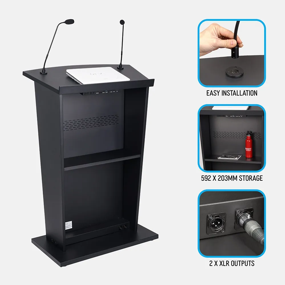 The LCD digital display lectern, like other commercial signage podiums, is designed to support presenters with user-friendly features. A large 656 x 432mm angled top surface can holds laptops, notes, or tablets securely, with a 9.5mm front lip to prevent materials from sliding off. The internal 592 x 203mm shelf provides hidden storage for personal items, placement of additional peripherals, and more. There are (2) microphones included that easily connect via integrated XLR ports on the top surface, with matching XLR outputs for connecting to in-house sound systems. A 2-year warranty is included to provide peace of mind, covering normal and reasonable use.