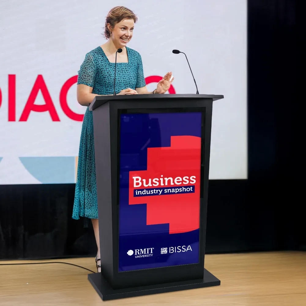 This podium is made from steel with a black finish, combining a sleek look with durability of the 49kg unit. Self-leveling feet help keep the unit steady on uneven flooring and protect surfaces from damage. Rear ventilation holes ensures airflow to the screen to prevent overheating during long sessions, with the commercial grade signage rated for 18 hour a day, 7 days a week usage. Access to the screen ports and outputs on the rear of the display are easily accessible for full set-up. Order online from Slimline Warehouse today for fast Australia-wide shipping and upgrade your event setup with an all-in-one digital podium solution.