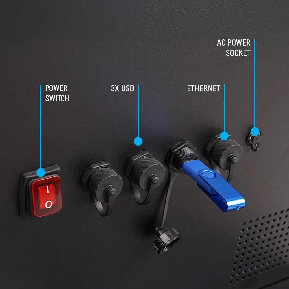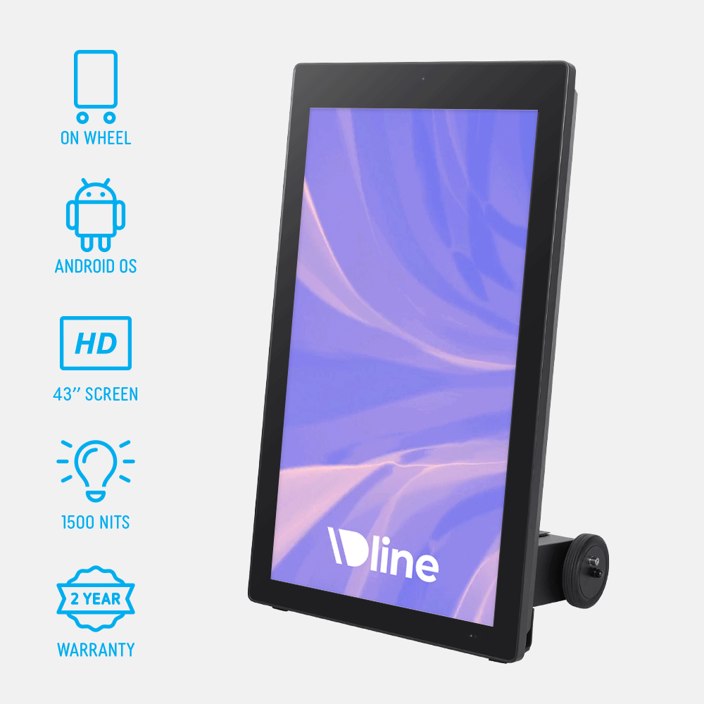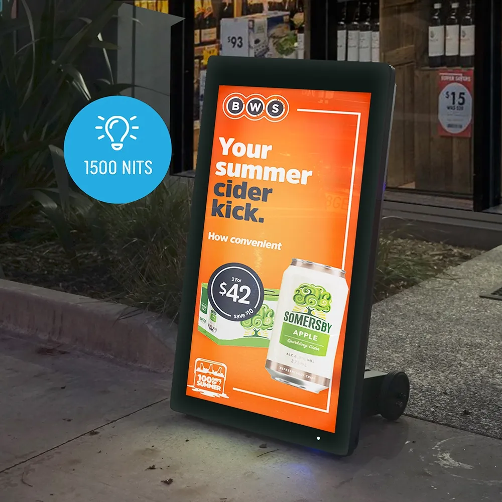 - Outdoor digital signage features a 43” LCD panel with 1920 x 1080 resolution and 1500 nits brightness