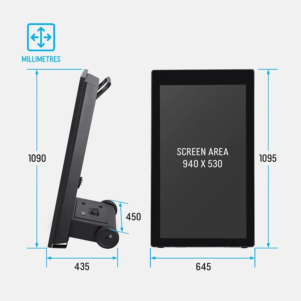 Outdoor digital signage, like portable digital sandwich boards, features a wheeled base and built-in handle to make positioning the screen where needed and bringing it inside in between uses easy. The 60kg unit has locks built into the wheels as well to help deter theft of the 1094 x 643 x 436mm unit. Non-slip mats on the base below the screen help keep the unit in place & prevent monitor damage. The screen has Android® 11 built-in for operation along with GTV. A whole range of Apps are available to customise the unit to your liking, and the included remote control makes navigating the screen simple. Cloud-based content management means you can remotely updated displayed items and scheduling, removing the need to reprint new marketing materials to help prevent waste. 4GB of RAM and 32GB internal storage capacity ensure a fast display with heaps of storage for media files. The unit includes a 1-year warranty that covers normal and reasonable use to provide peace of mind.