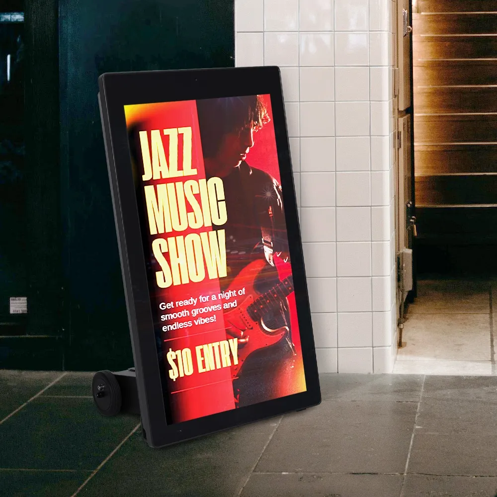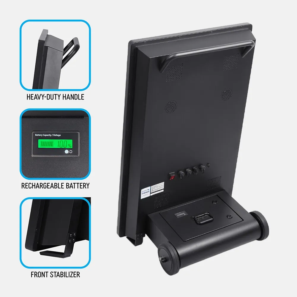 This portable advertising A board is made from robust steel and aluminium to be long-lasting. The sleek black finish fits in with any décor style. There are multiple inputs, including HDMI, USB, and RJ-45 along with an internal WiFi antenna at 2.4Ghz. Two built-in 10w speakers on the back allow audio to accompany displayed content for further engagement. Order online today for quick shipping to anywhere in Australia and to utilise this unit at retail stores, night markets, gas stations, bottle shops, gyms, cafes, arenas, bars, trade shows, and so much more!