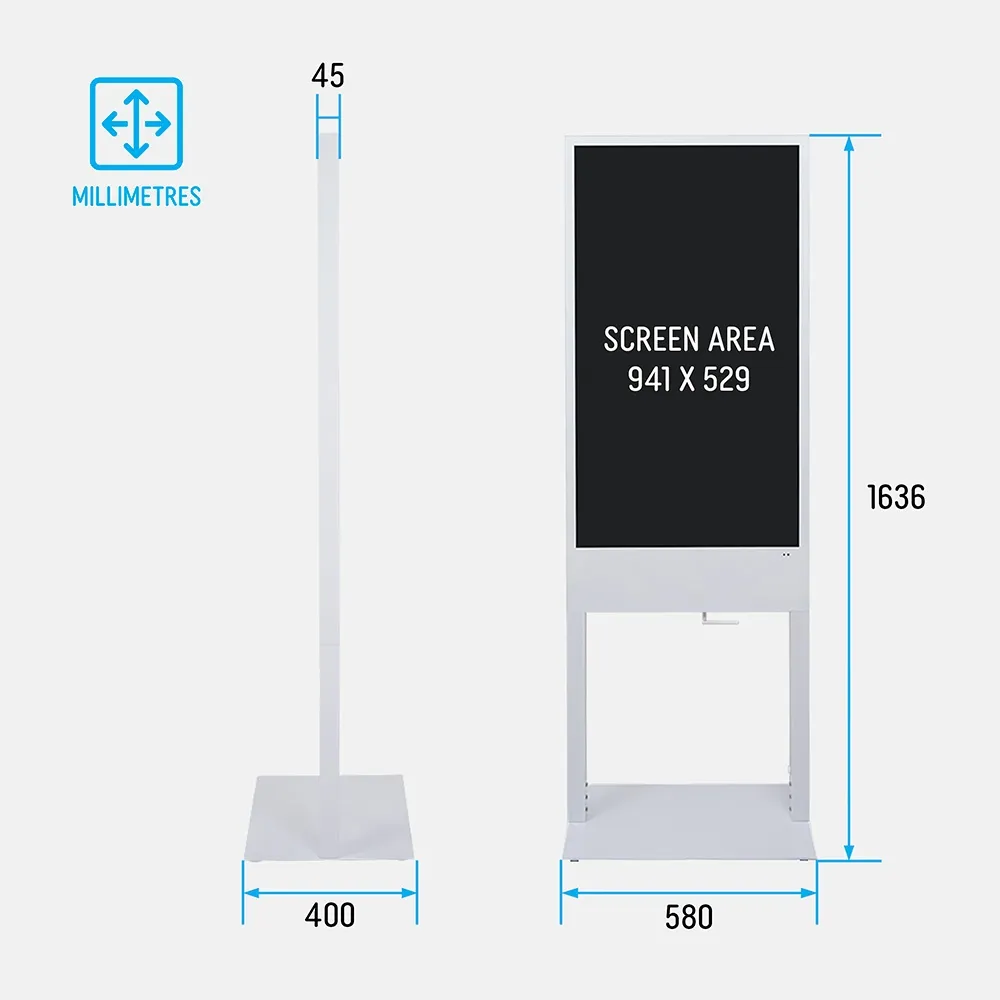 This display is made out of a combination of steel and aluminium for durability whilst remaining cost effective, with a white finish for a professional appearance that fits in well with any style of décor. The included remote makes navigating the screen and setup simple due to an intuitive design. There are two 8W speakers if wishing to accompany content with audio, and an output on the back allows for connection to external speaker systems. This unit is shipped almost completely assembled, with only the base needing to be attached. Slimline Warehouse offers fast shipping Australia-wide with same-day dispatch if ordered by 3pm AEST, buy online today!
