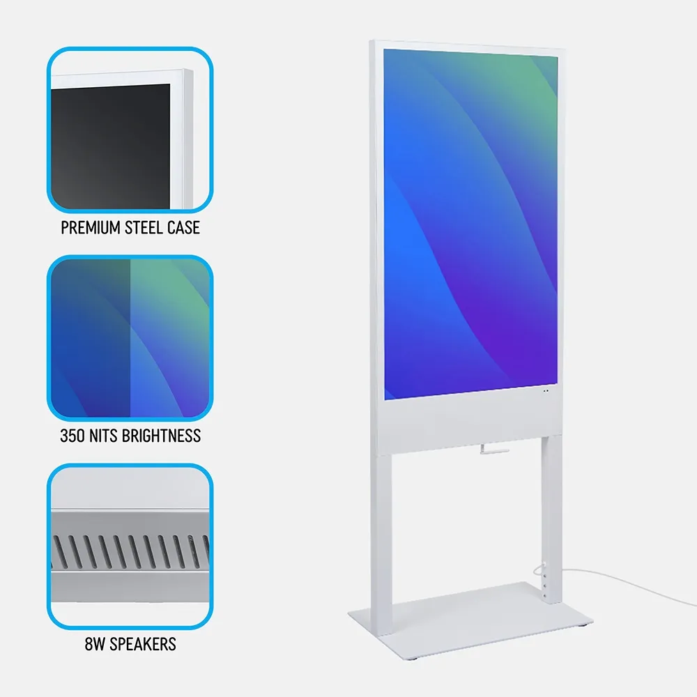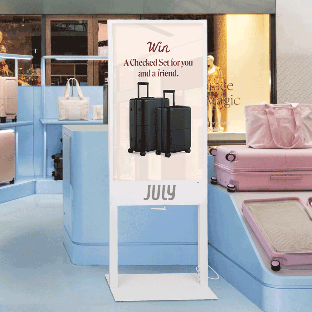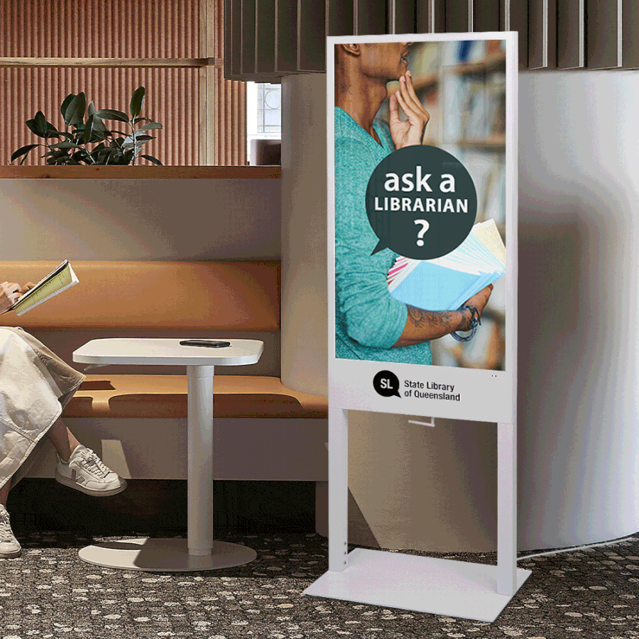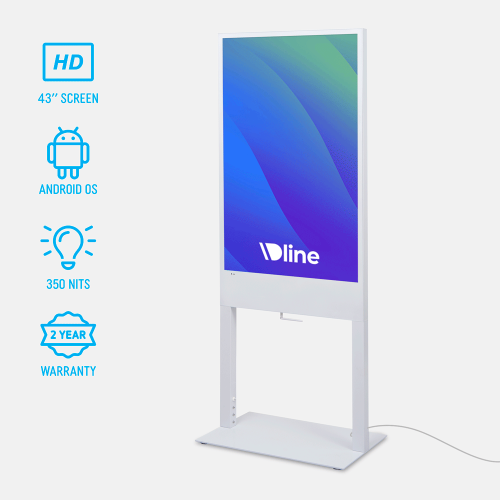- Digital poster kiosk features a 43” LCD screen with 1080 x 1920 resolution for crisp visuals