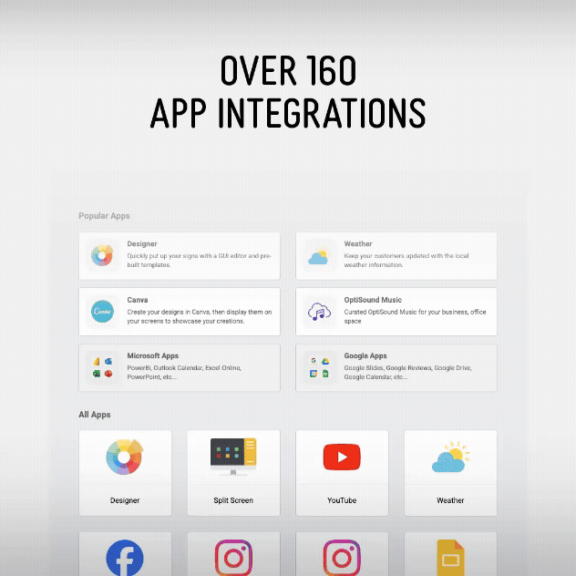 Supports a wide range of file formats (including JPG, PNG, GIF, MP4, PDF, and PPT) as well as popular platforms like Power BI, Google Slides, and cloud storage systems (OneDrive, Google Drive) for easy content management. With our 160+ apps, you can also add weather, social media feeds, Google Reviews, websites, and YouTube videos to your displays. Plus with our Enterprise API, the possibilities are endless.