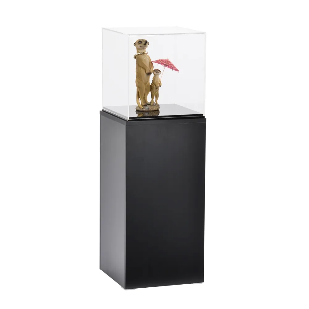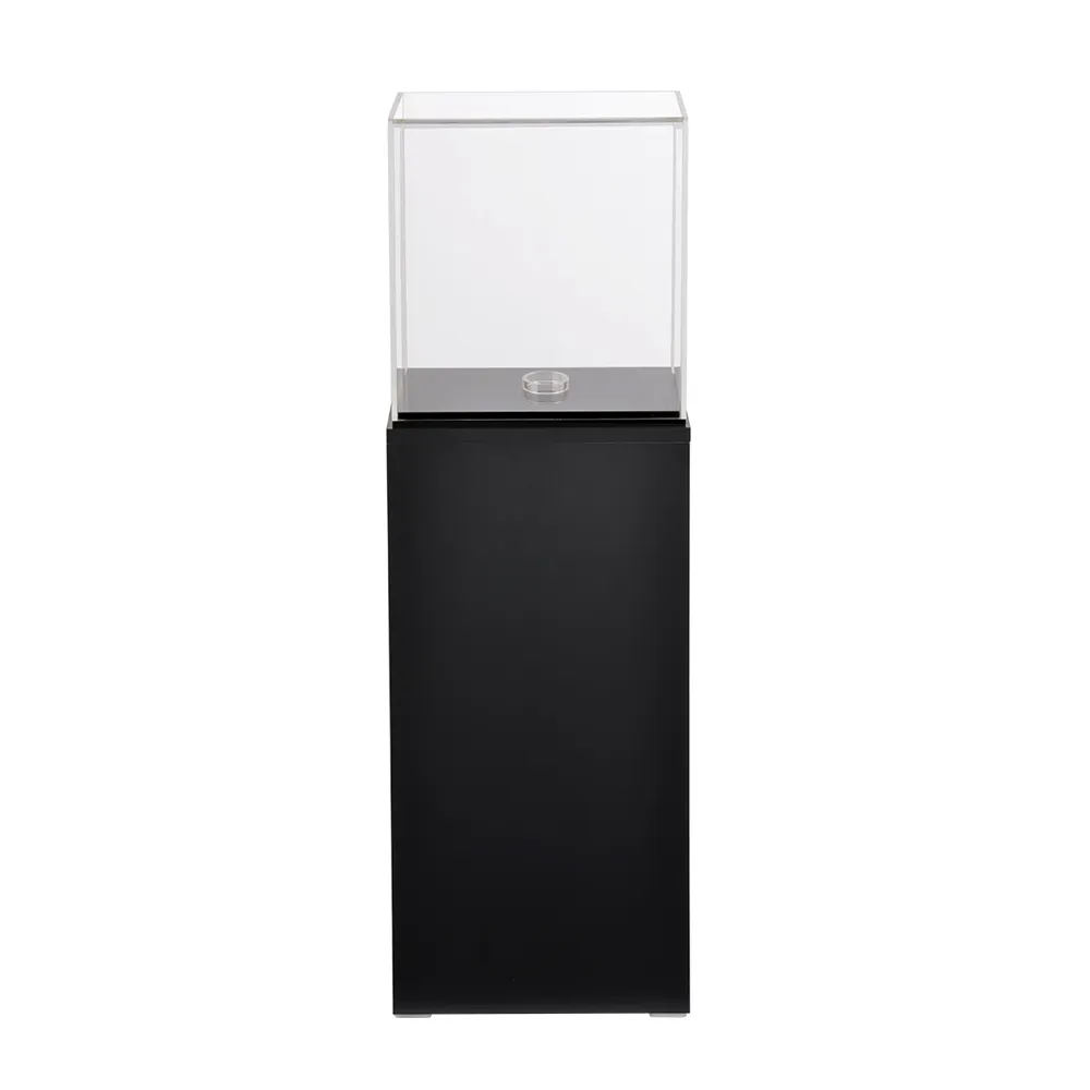 - Acrylic cube pedestal has 76cm tall timber plinth with black finish