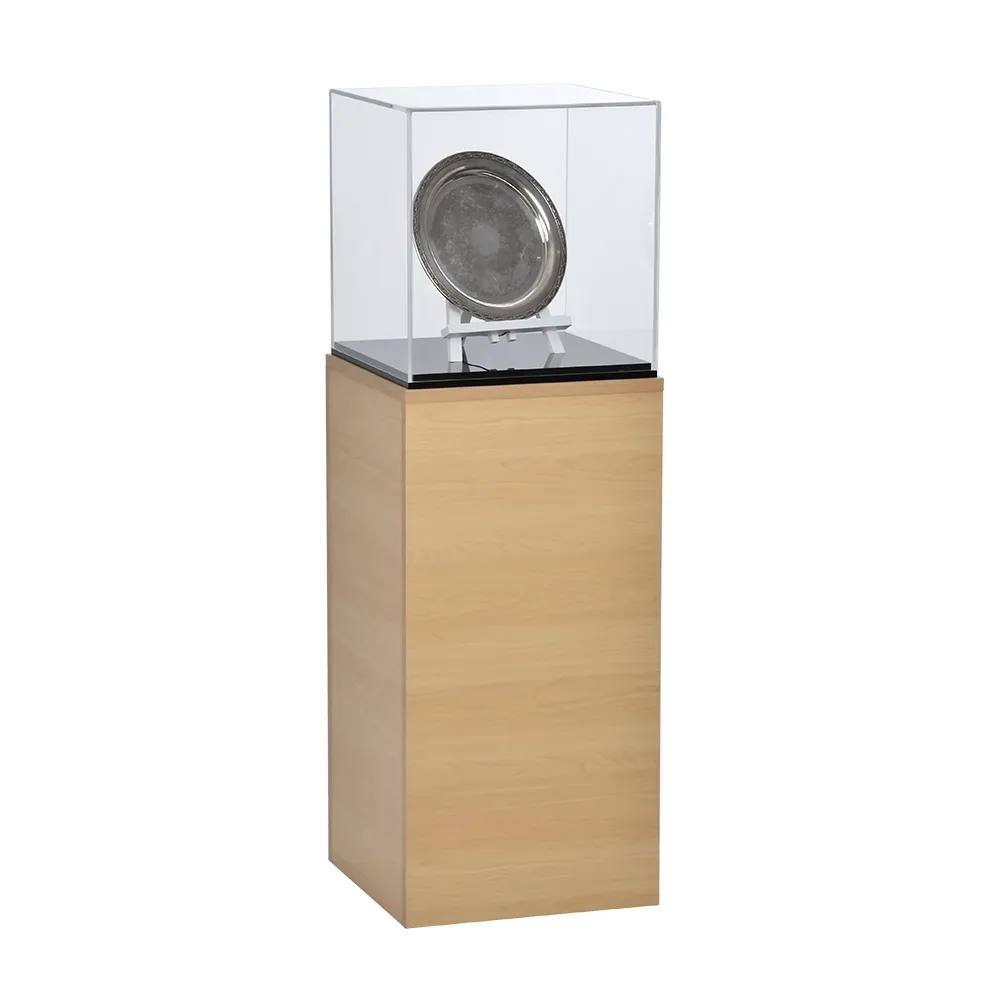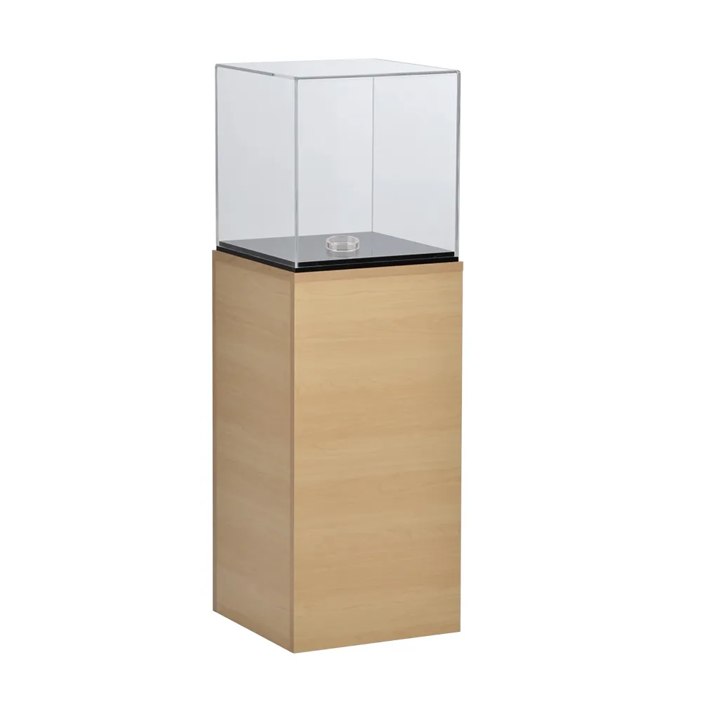 This plinth stand, one of many available retail store displays, has a total height of 116cm including the pedestal and display case. The column itself is 76cm tall and has a 382 x 382mm footprint to make it easy for visitors to walk around the unit and examine items without being impeded. The top surface area is 38 x 38cm to easily accommodate the size of the acrylic cube. There are (4) double-sided tape squares provided to attach the perspex box to the top of the pedestal. This display is great for not only showing pieces and artifacts in museums or art galleries, but can really make products stand out in retail stores, exhibit halls, and jewelry stores.
