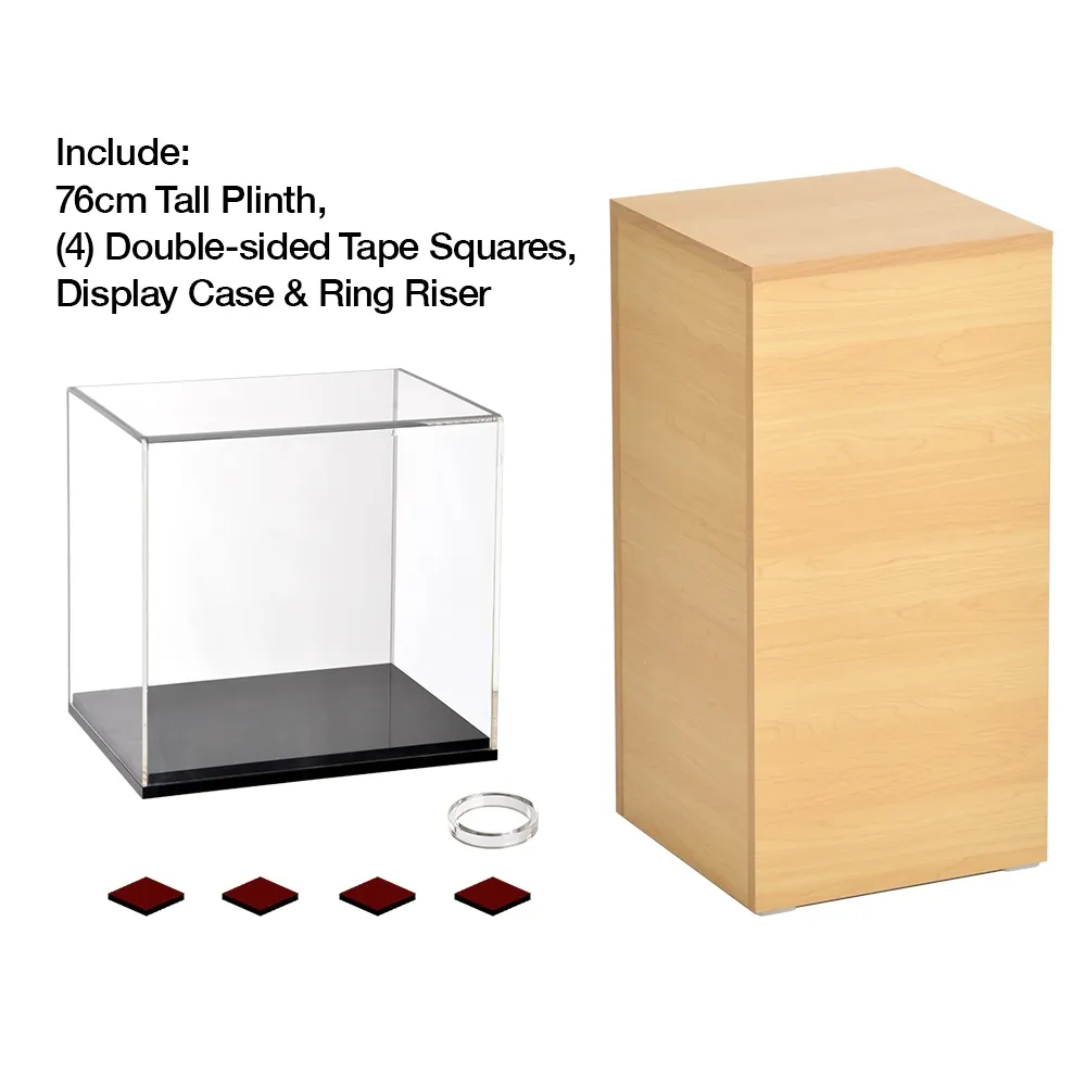 This plinth stand has a 385 x 369 x 369mm acrylic cube that rest on to of the column, allowing you to showcase a variety of items safely. The pedestal display cases use 6mm thick clear perspex with UV protection and polished edges to create a stylish stand that offers a full view of displayed items whilst preventing theft and keeping out grind and dust. This cube rests on a 20mm thick black glossy acrylic base with ridges to ensure it remains in place whilst in use. A ring riser is also included, with the 5mm thick clear ring not allowing round objects to roll during display.
