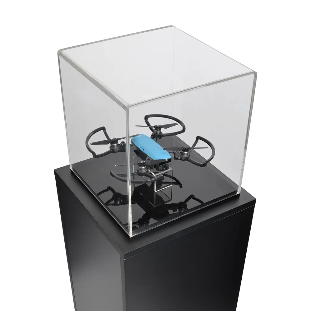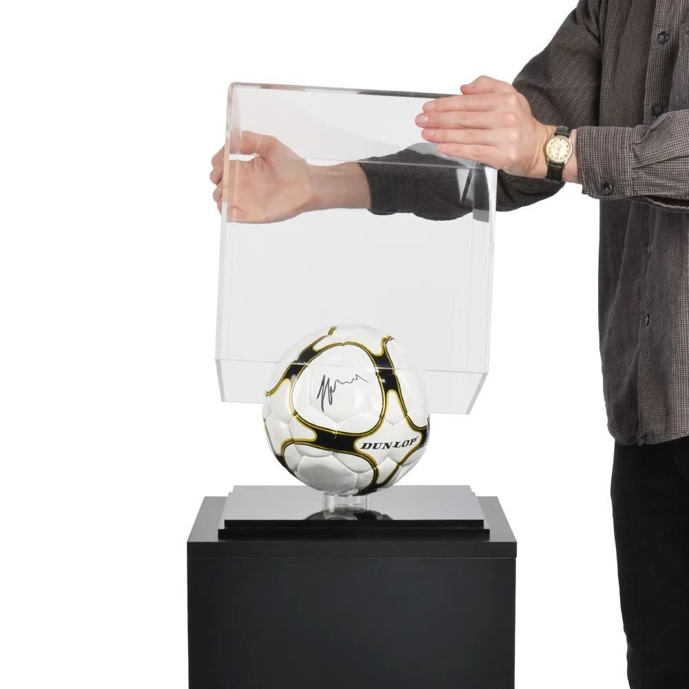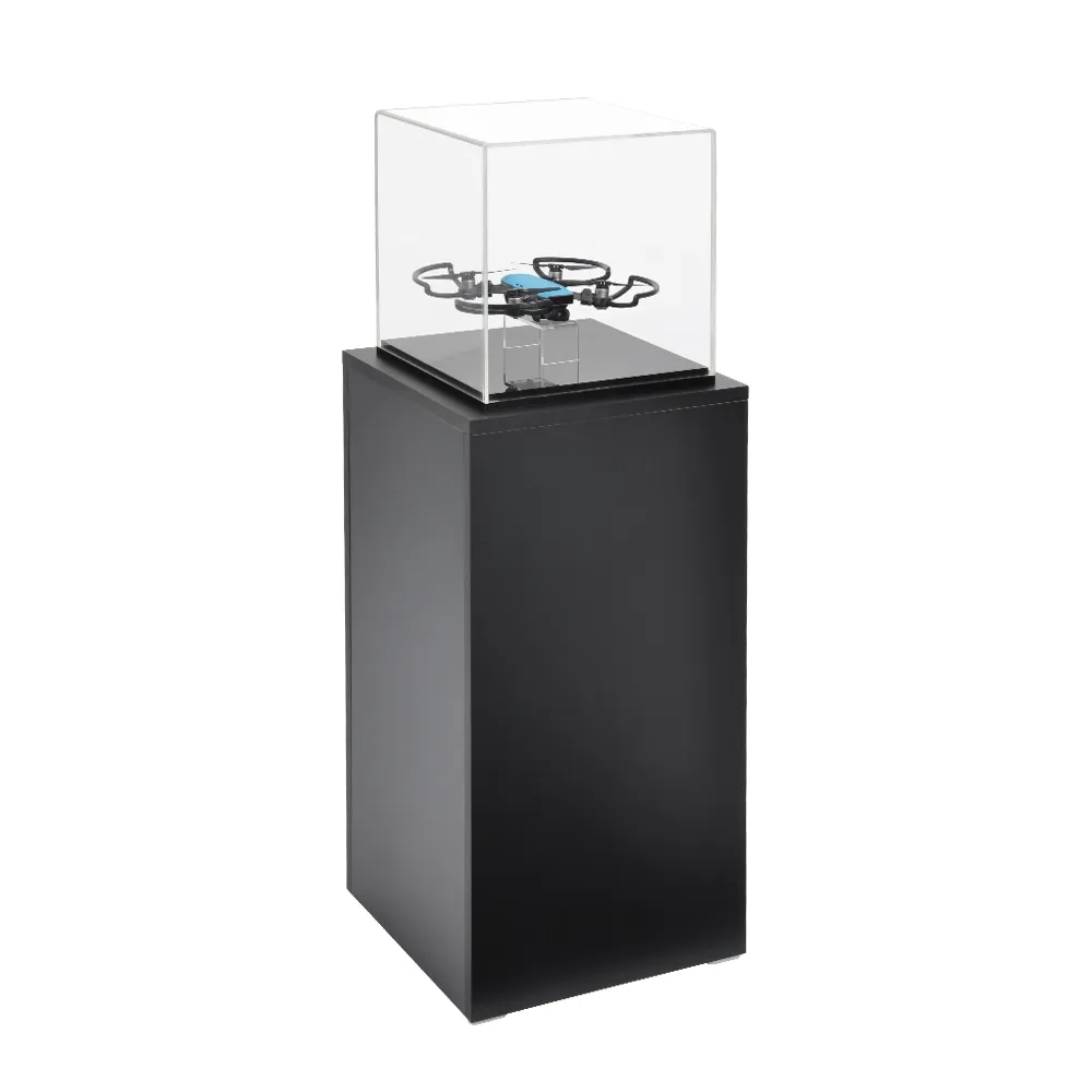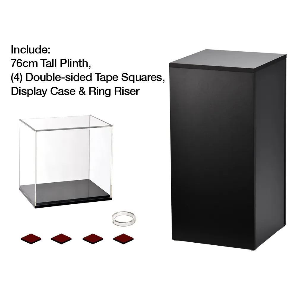 A modern pedestal stand has a 317 x 317 x 332mm display cube to protect displayed items from theft and unwanted touching whilst preventing the buildup of grime and dust over time. The box is made from 6mm thick clear acrylic with polished edges and UV protection to provide a durable case that is fully viewable from all sides. The professional look and protection from fading make this a perfect case to rest on display plinths. The bottom of the box is made of 20mm thick black glossy acrylic, with ridges along the outside perfectly fitted to keep the display cube in place. For locations wishing to display round objects, there is a 5mm thick clear perspex ring riser that prevents items from sliding out of place.