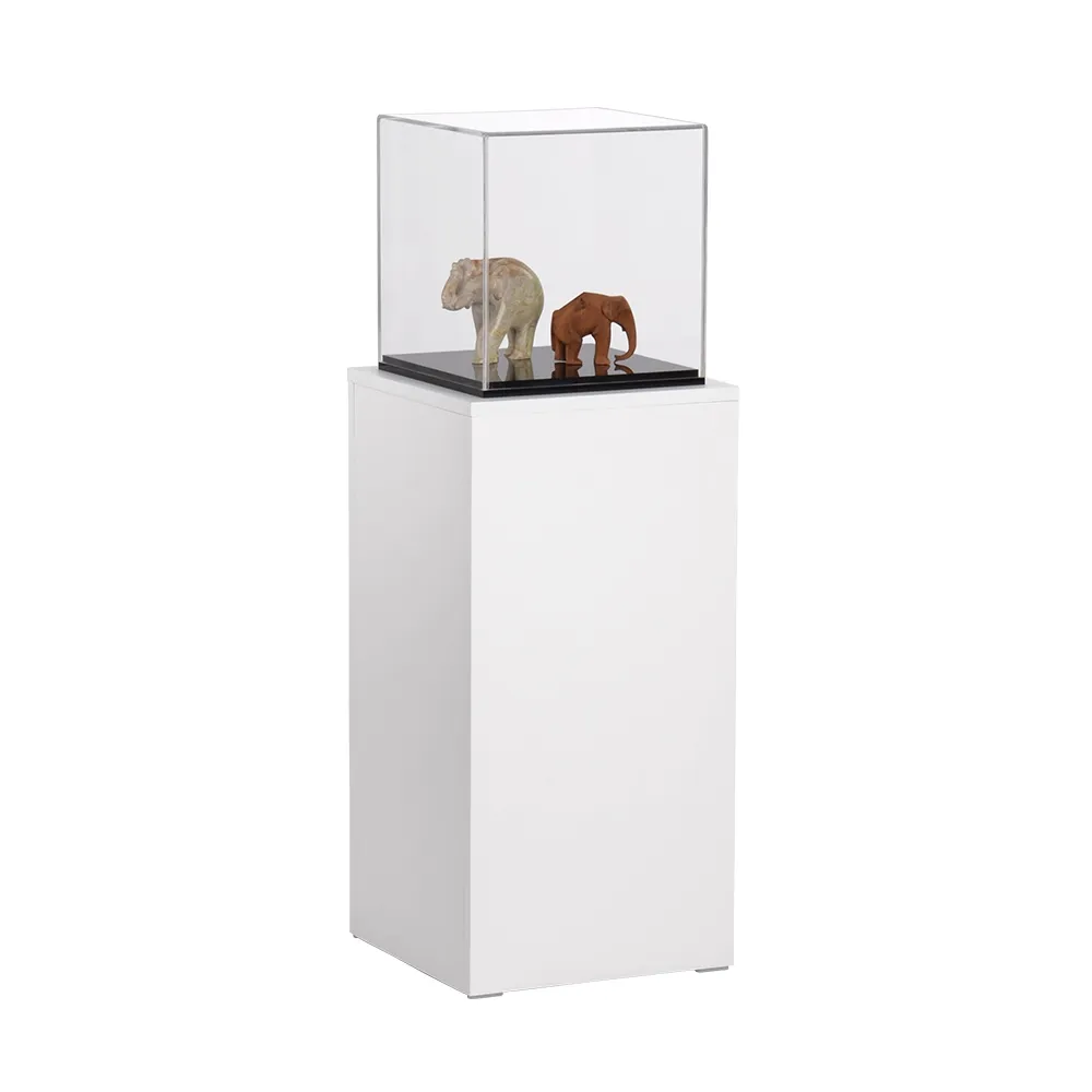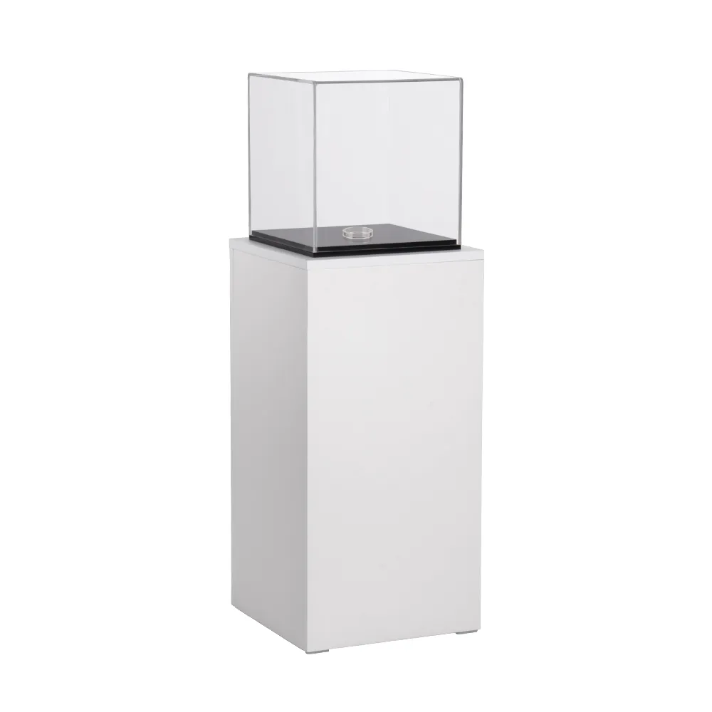 - White pedestal has 317 x 317 x 332mm acrylic cube to hold items atop column